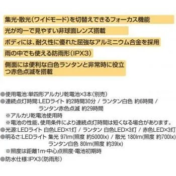 側面に白色ランタンと非常時に役立つ赤色点滅を搭載したハンディライトです。雨の中でも使える防雨形(IPX3)。