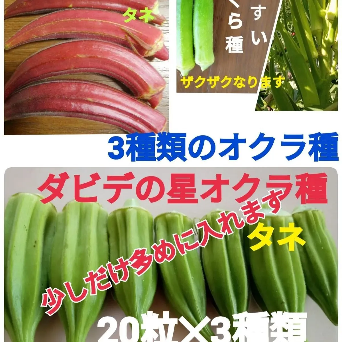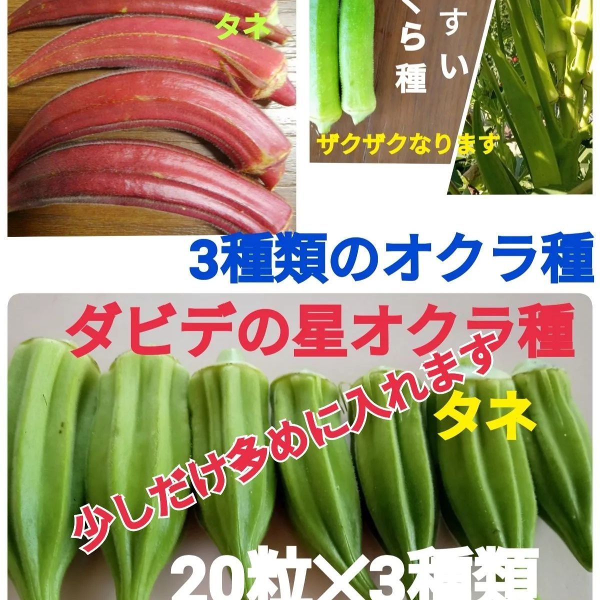 お値下げしました オクラ種 3種類の種 7年度 自家採種した種 オクラ種 ダビデの星➕赤オクラ種➕白オクラ種 白ヒスイ 農薬不使用 化学肥料不使用で作っています 各20粒 少し多めにいれます