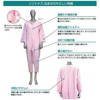 寝たきりの方の介護がしやすいよう、素材と機能にこだわって開発された介護寝巻です。胸元から足までフルオープン式のファスナーと、点滴などの医療行為や寝たきり、片マヒの方の着替えや清拭が楽に行える腕ファスナーがついています。おむつ交換に便利な股ファスナーもついています。