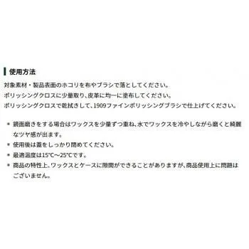 厳選されたワックスが皮革に栄養と高い光沢を与えます。つま先やかかと部分の鏡面磨きに使用すると滑らかで美しく仕上がります。