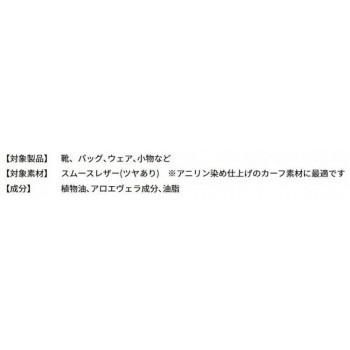 浸透力に優れた植物性オイルとアロエヴェラ成分が皮革に潤いのある光沢を与え、繊細なアニリン染め仕上げのカーフ、ラム革などの質感を高めます。