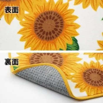 シルキータッチの起毛生地で足元ふんわり。明るくて華やかなひまわり柄のキッチンマットです。裏面がすべりにくい加工になっています。