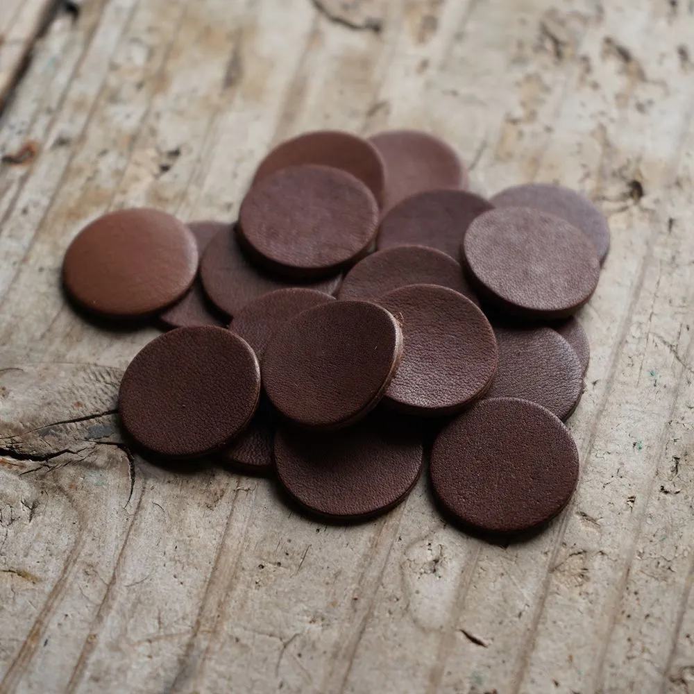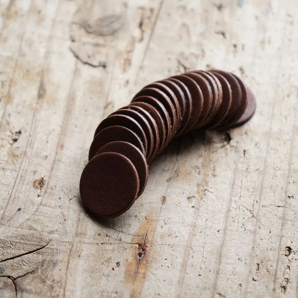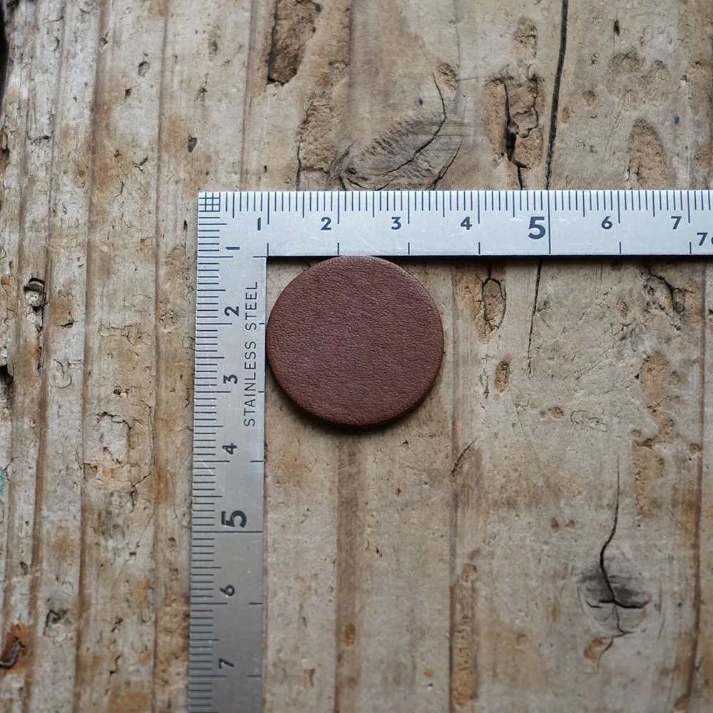 現役のレザー職人が厳選した高品質な本ヌメ革を、自分で切るには手間の掛かる正確な25mm径で切り出しているため、届いてすぐに刻印やタグ作りなどのプロ仕様なカスタマイズを楽しめるのが最大のポイントです。