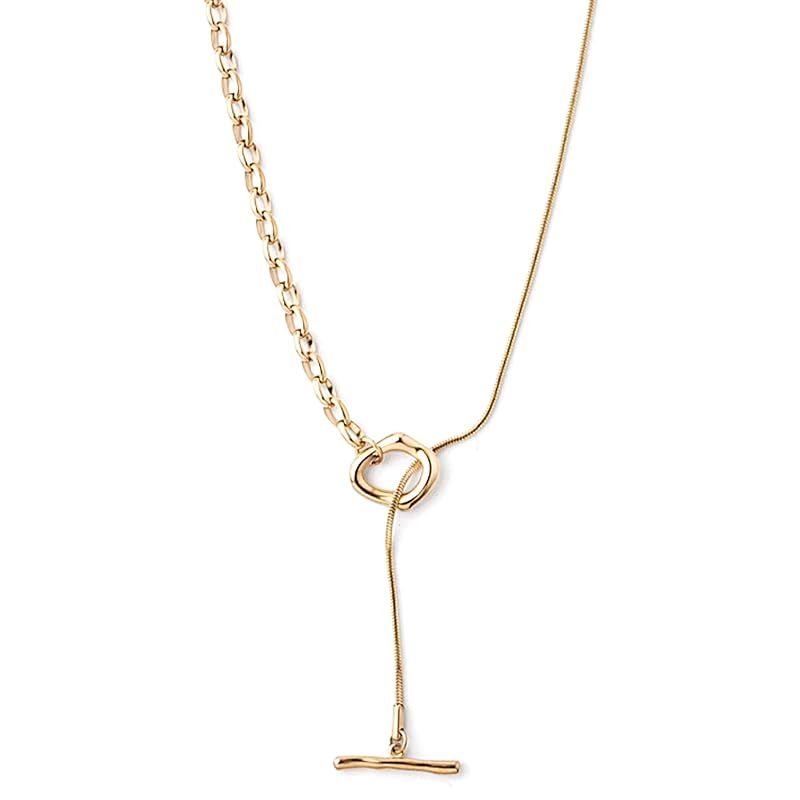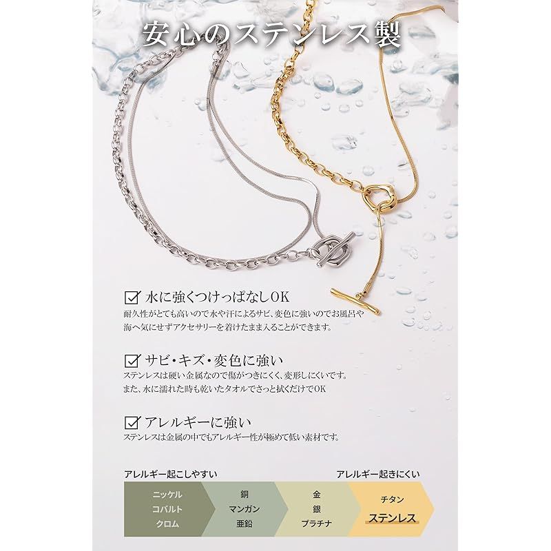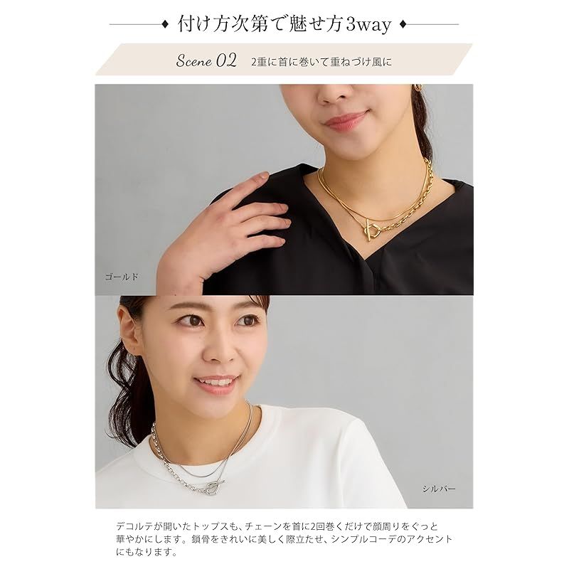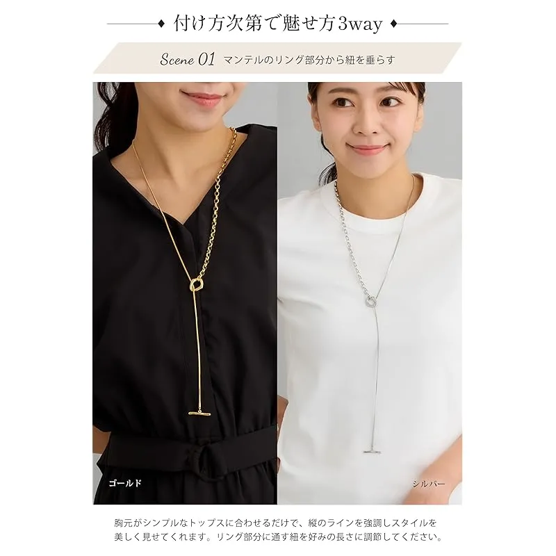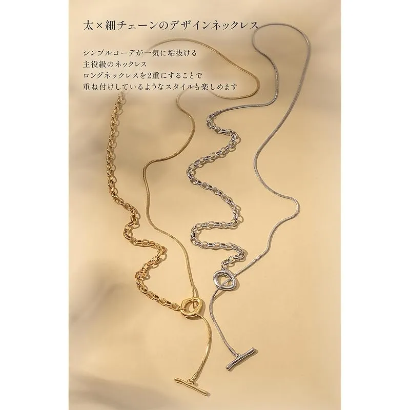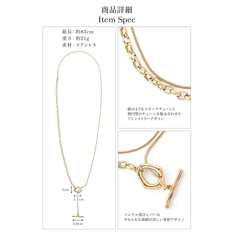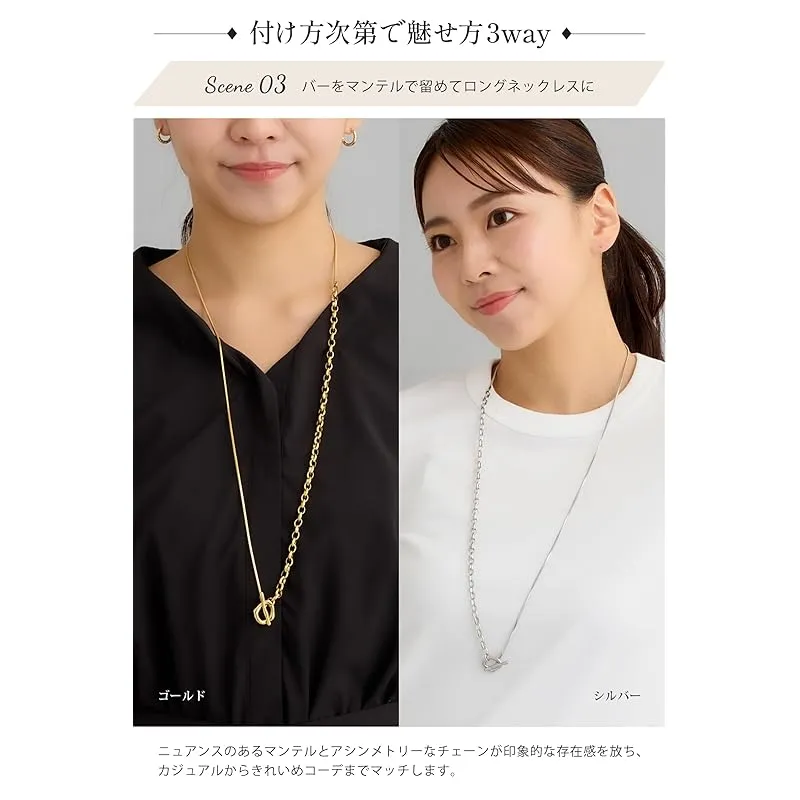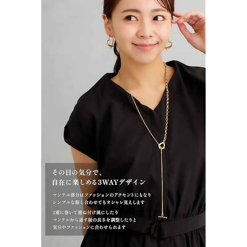 【上品な光沢を放つアシンメトリーマンテルネックレス】 スネークチェーンとあずきチェーンのアシンメトリーチェーンと、存在感のあるマンテルがモダンな印象を演出します。 どんなファッションにも合わせやすく、シンプルながらも洗練されたデザインが魅力。 着用方法が3wayで選べるのでカジュアルコーデにはもちろん、オフィススタイルやドレスアップにもぴったりです。