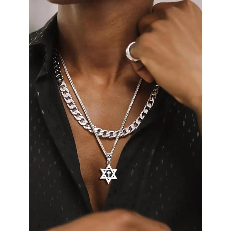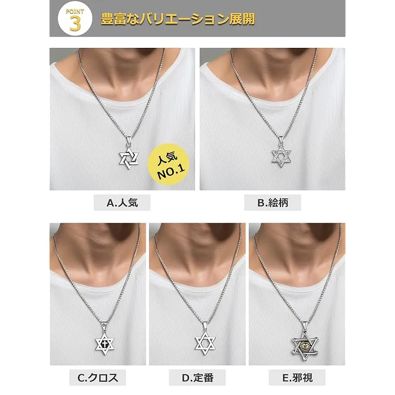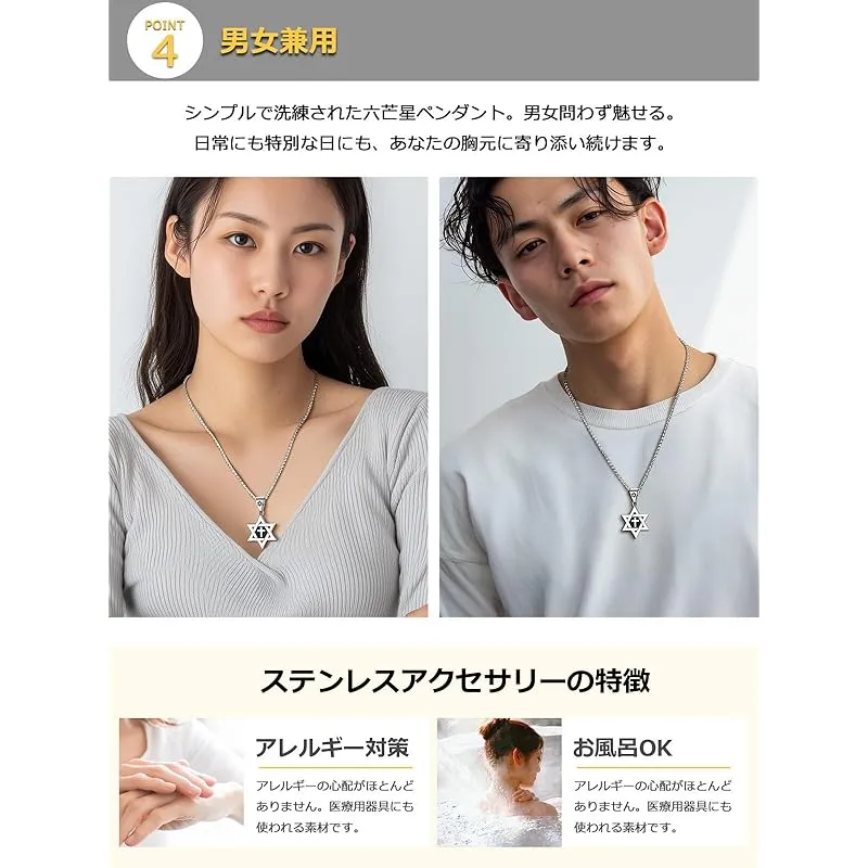 【豊富な5デザインで男女兼用】シンプルなものから個性的な六芒星ネックレスまで5種類のデザイン展開。定番のスタイルなので、パーティーはもちろん、カジュアルな日常使いにも合わせやすく、男女問わずお楽しみいただけます。お好みの一枚を見つけてください。
