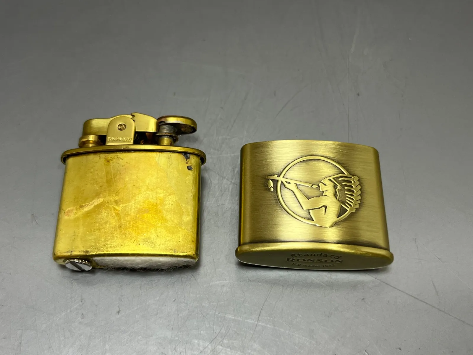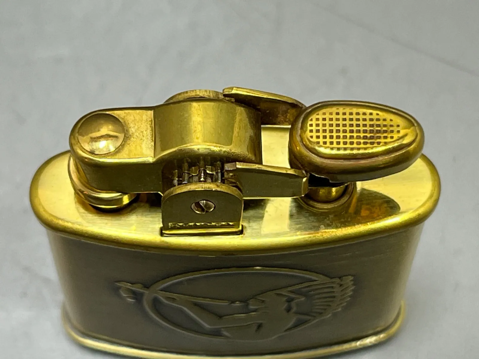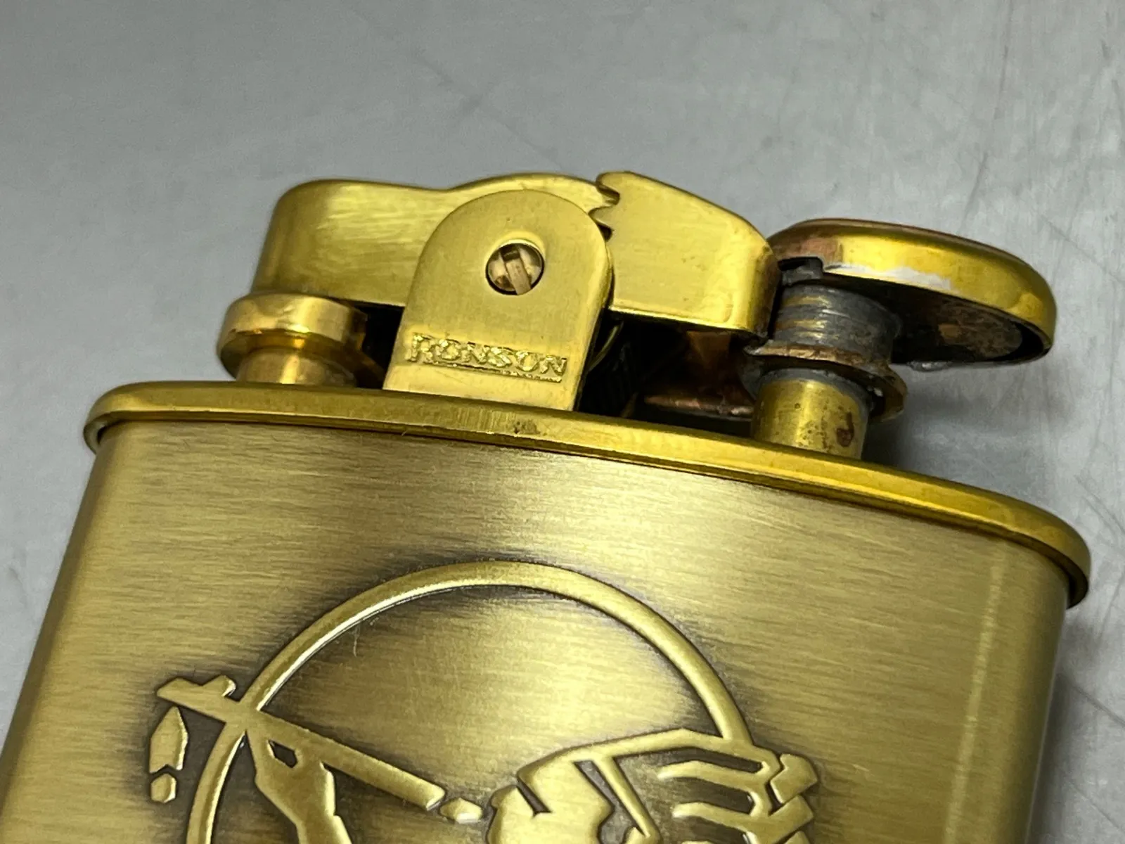 デザイン: 真鍮(ゴールド)の本体に、アメスピを象徴するインディアン(チーフ)のロゴが大きく凸刻印されています。