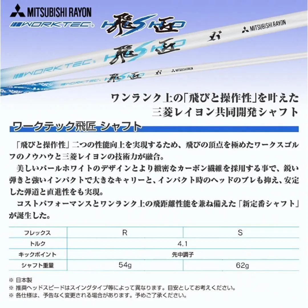 しかも、シャフトは鮮明なパールホワイトと鮮やかなブルーのグラデーションが装着感抜群で、ツアーでも人気の高い三菱ケミカルと、ワークスゴルフが共同開発したプラス10ヤードの飛びと操作性の高い三菱ワークテック飛匠ハイグレードシャフトを装着しています。