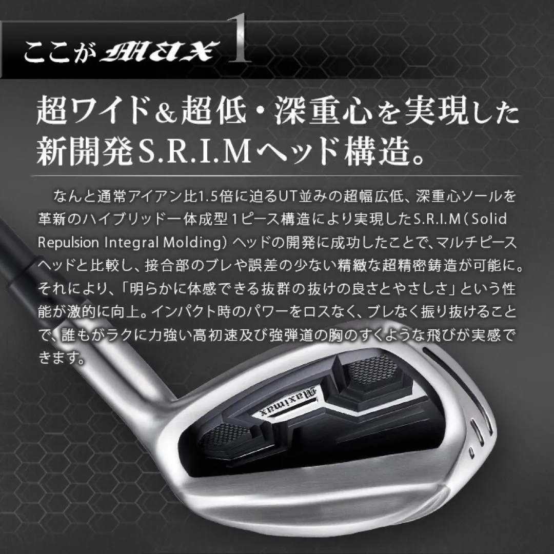 その飛びの秘密は、ドライバー譲りの2.8ミリ肉薄強反発フェースと、新開発S.R.I.Mハイブリッド1ピース構造により、通常アイアン比約1.5倍で45%アップ!という、UTに迫る超幅広ソール及び、超低・深重心ヘッドにより、「明らかにわかる飛びの違い」を実現。