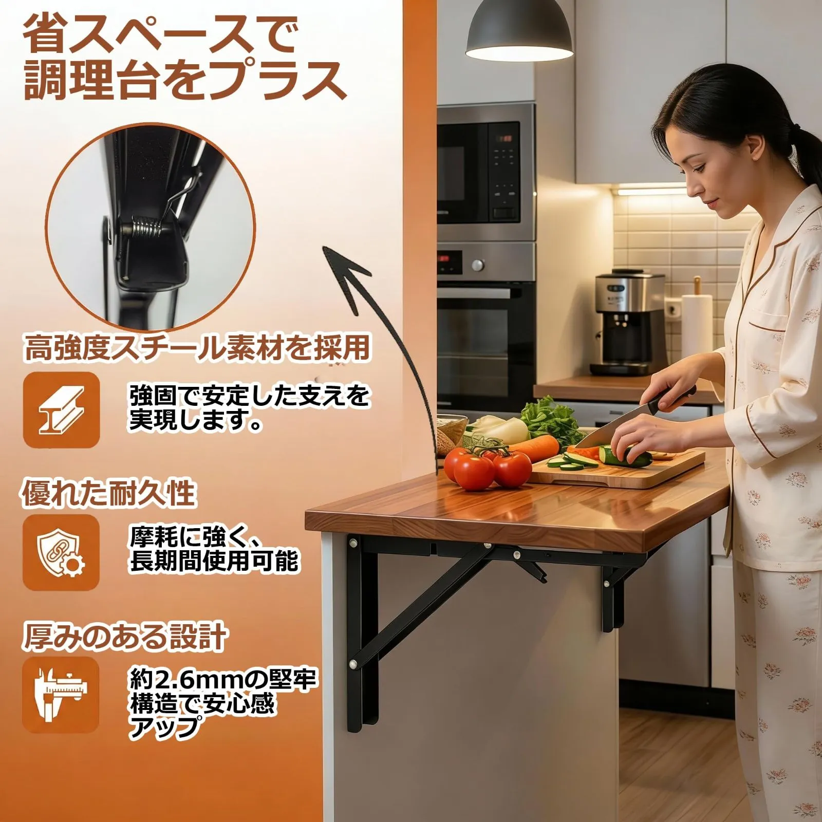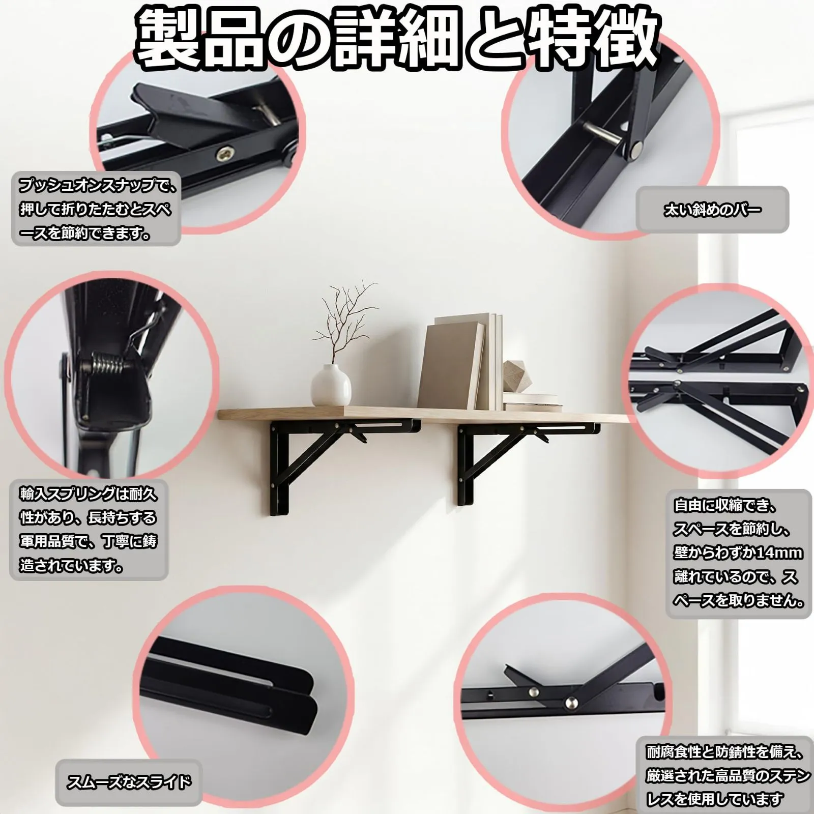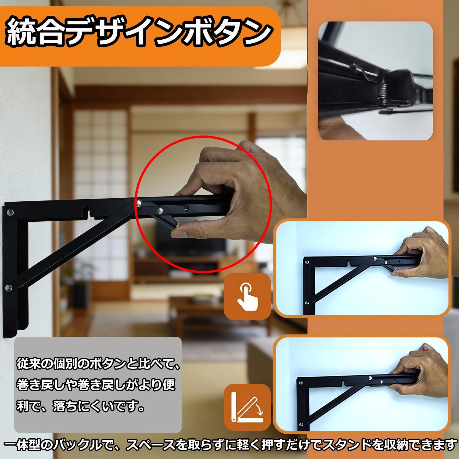 【便利な折りたたみ収納棚】ワンタッチで簡単に折りたたむことができる折りたたみ式ブラケット。使用しないときはコンパクトに収納でき、スペースを節約します。折りたたむ際は少し引っ張りながら作業を行い、ボタンを押すだけで簡単に収納可能です。※指を挟まないよう注意してください。