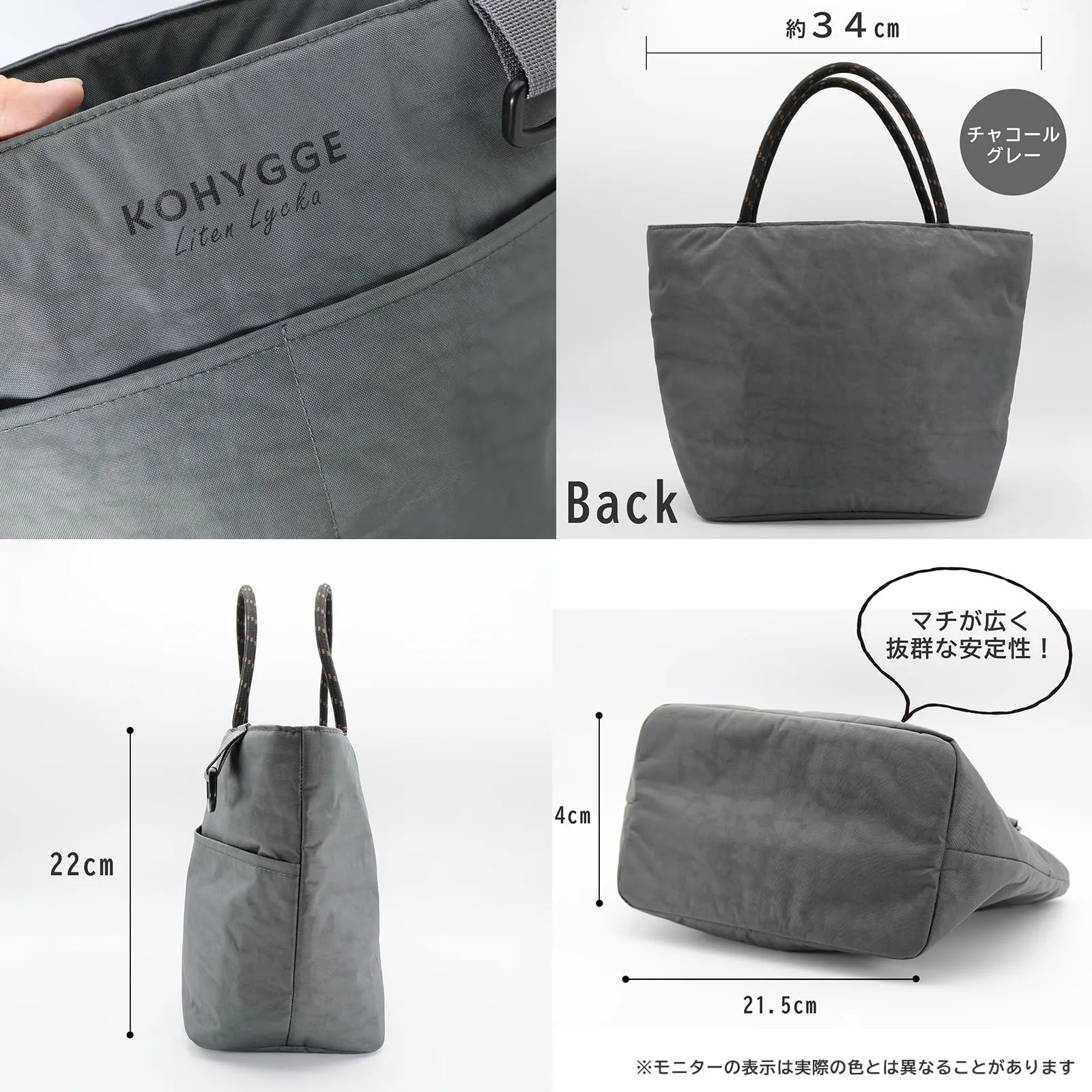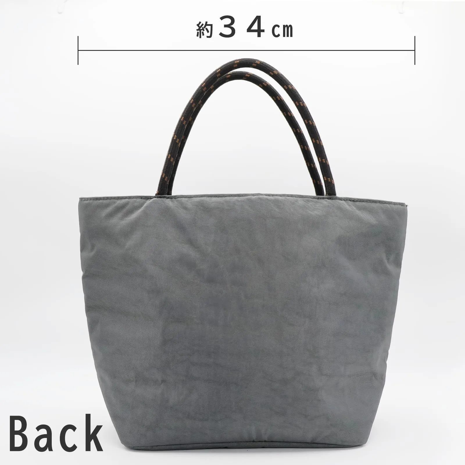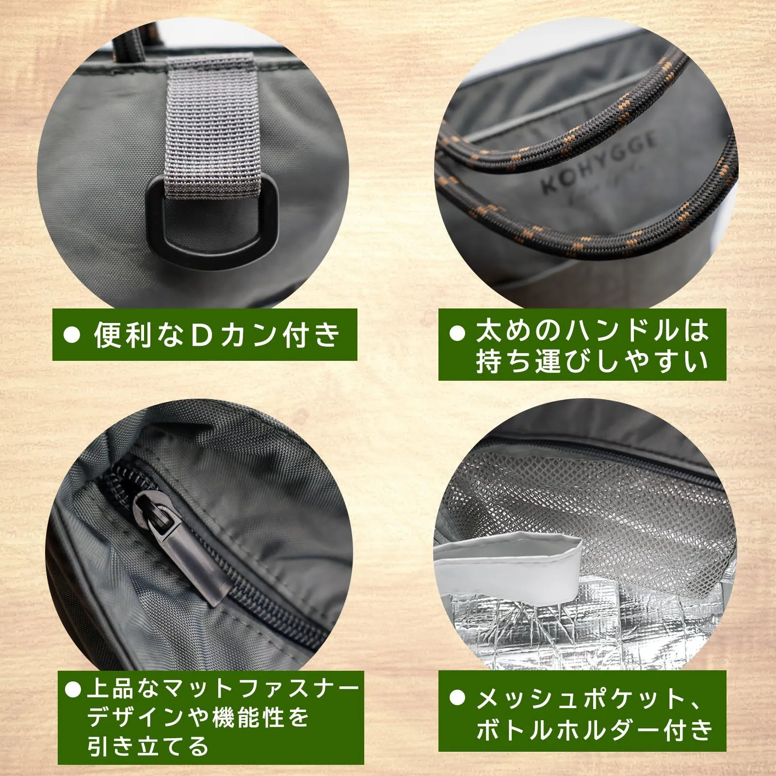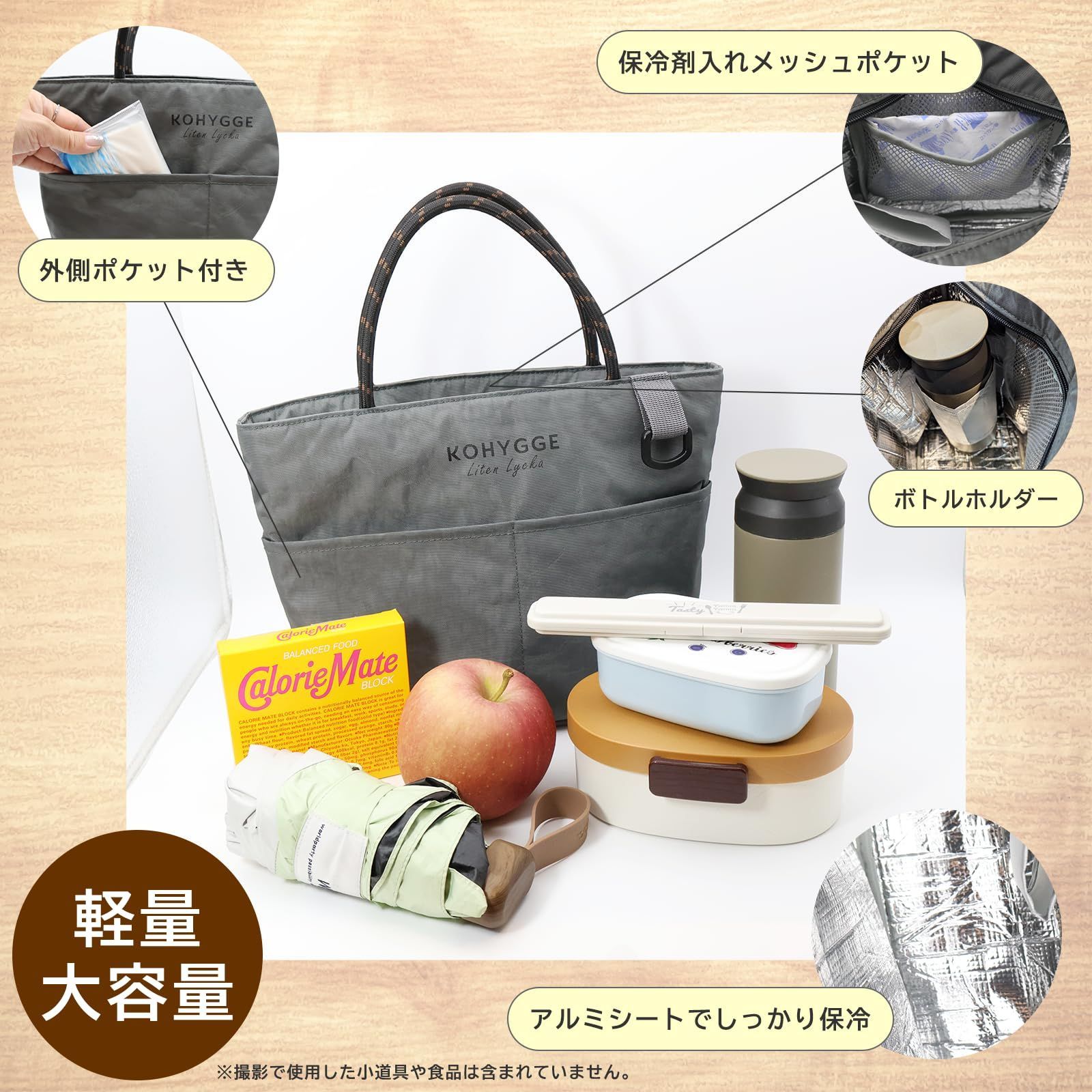 ナイロンで作られた本体には撥水加工が施され、ワッシャー加工により自然なシワと柔らかな素材の感触が際立つデザインが特徴です。 内側はアルミフィルムでしっかりと保冷効果を保ち、メッシュポケットやボトルホルダーが付いていて、使い勝手が良くなっています。 外側にはポケットがあり、ティッシュやエコバッグなどの小物を収納することもできます。 マチが1広く、8mmの太さのロープハンドルで持ち運びが便利。 たくさんのお弁当や飲み物を入れることができます。保冷機能付きで、暑い日でも食材を新鮮な状態で持ち運ぶことができます。お弁当を持ってピクニックに出かけたり、オフィスで使ったりと、さまざまなシーンで活躍するアイテムです。