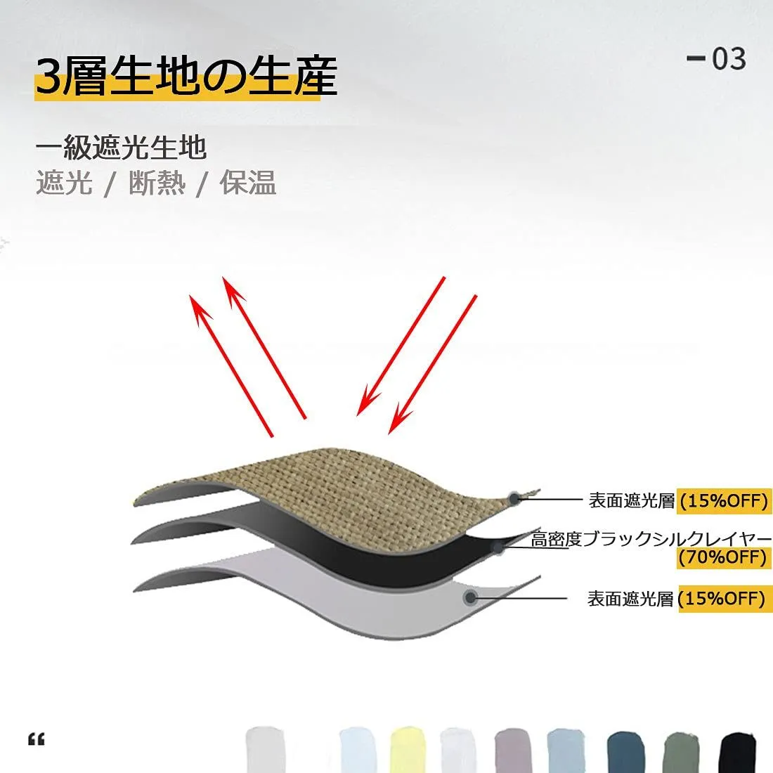 <三層構造生地>このカーテンは三層構造生地で作られた優れた製品で、表面は特別の素材は15%―20%の光を遮断して、中材は遮光材料で60%―70%の光を遮断して、裏地は15%―20%以上で遮光します。