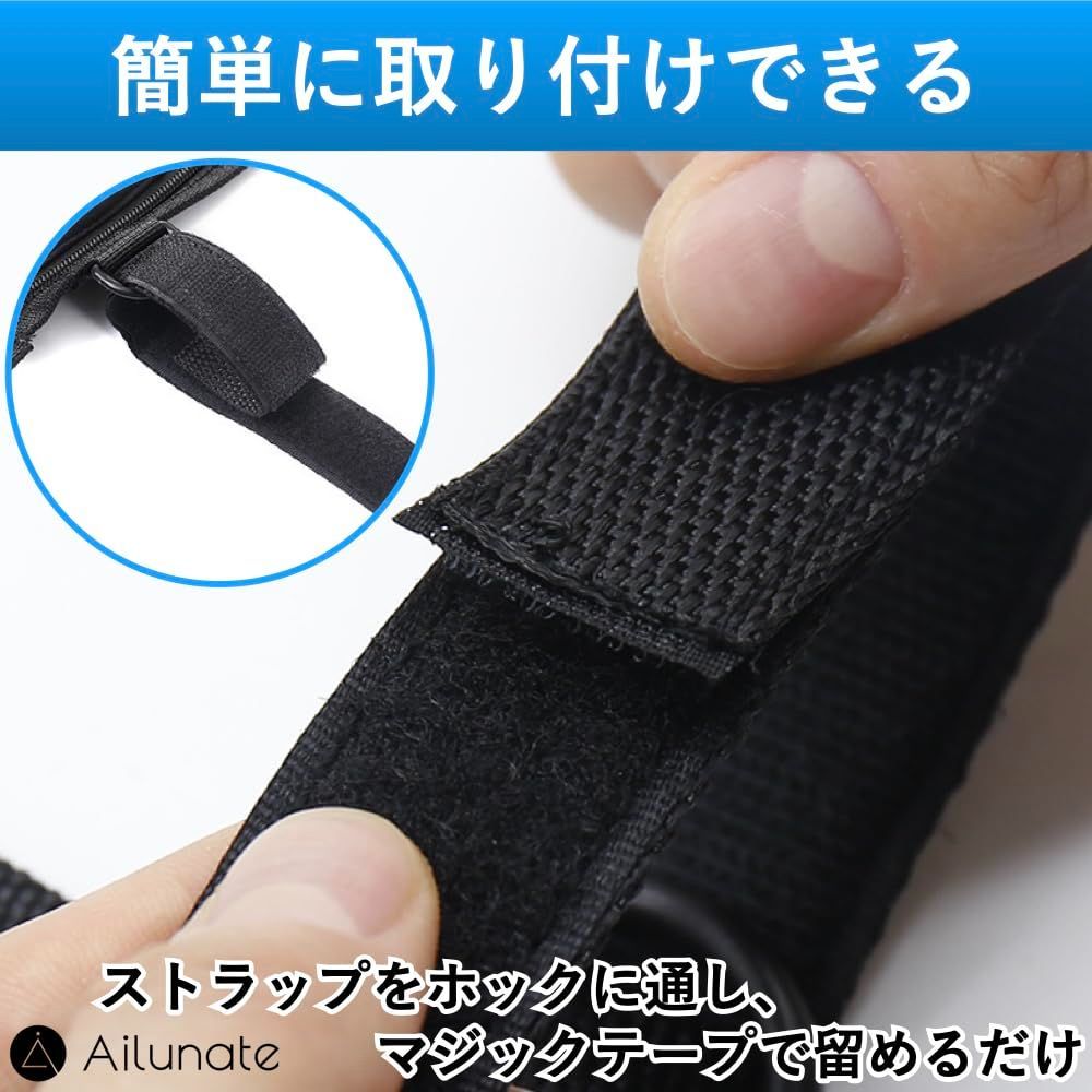 付属のストラップをポケットのホックに通し、ストラップのマジックテープで留めるだけで簡単に取り付けできます。