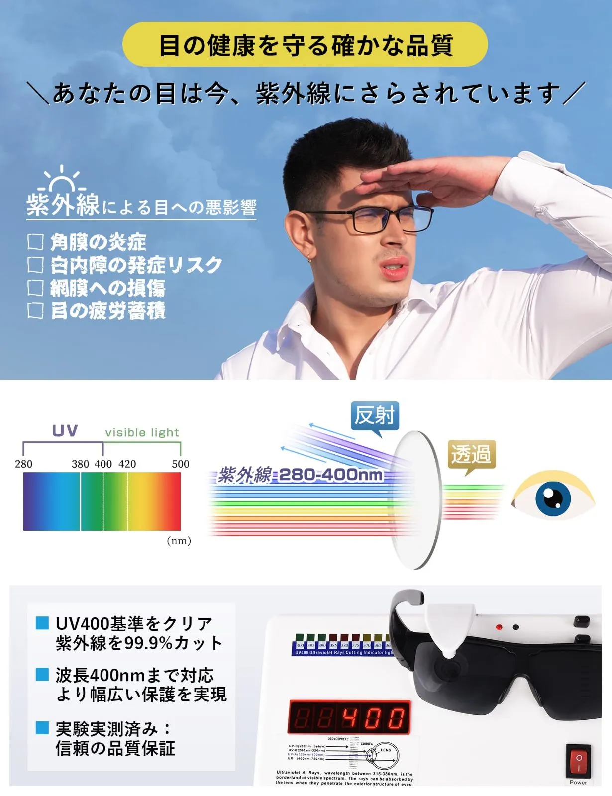 【最先端テクノロジー・確かな品質】 UV400基準をクリアし、紫外線を99.9%カット。波長400nmまで対応でより幅広い保護を実現。衝撃吸収TAC素材と耐摩耗コーティングにより、アウトドアでの過酷な使用にも耐える耐久性を確保。実験実測済みで信頼の品質付きです。