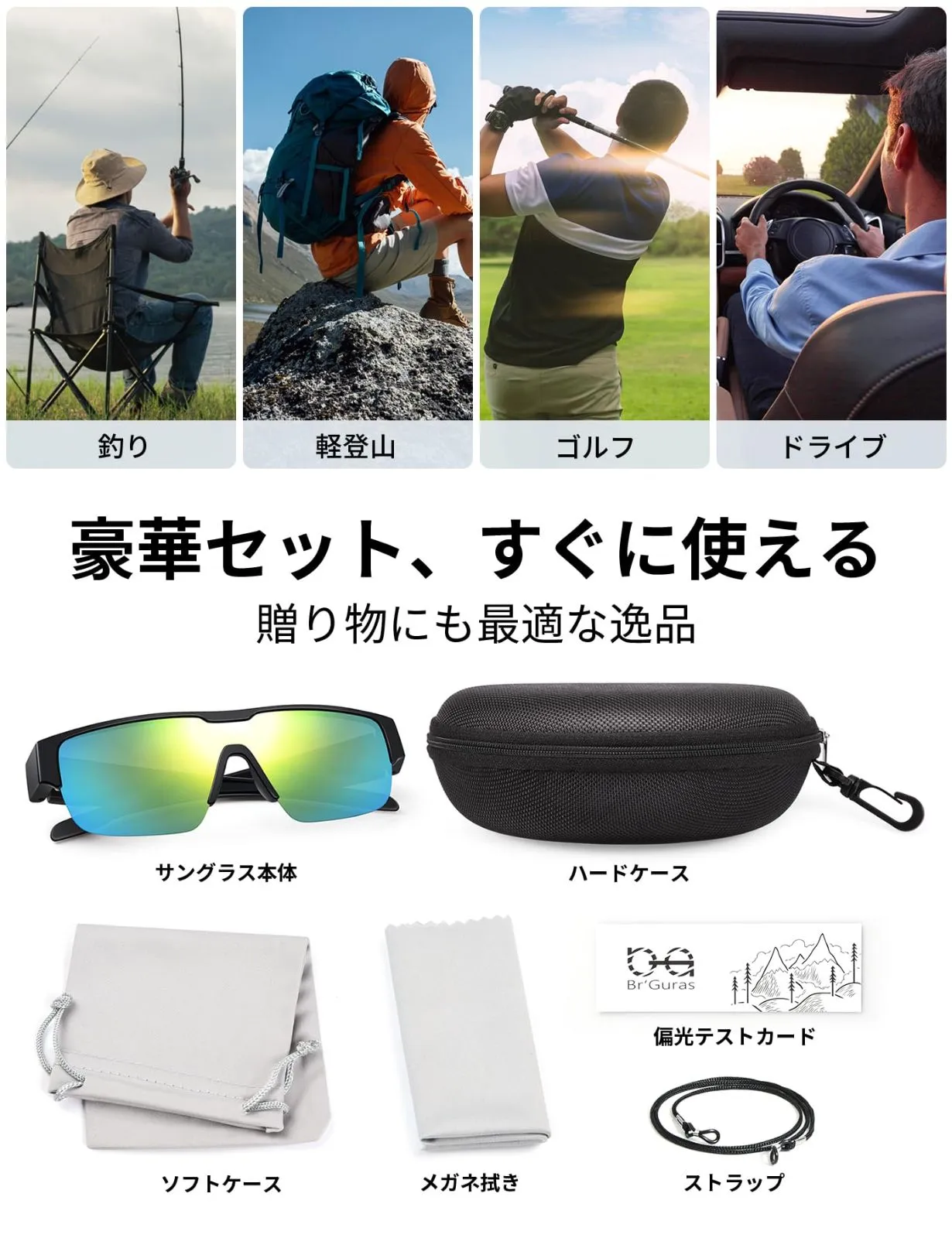 スポーティーなハーフリムデザインのサングラスで、釣り・ゴルフ・ドライブ・軽登山など様々なアウトドアシーンに対応。偏光機能付きで眩しさをカットし、水面の反射や路面のギラつきを効果的に抑制してクリアな視界を実現。UV400基準をクリアし紫外線を99.9%カット、衝撃吸収TAC素材と耐摩耗コーティングで確かな品質を。4色展開(ブラック・シルバーミラー・ブルーミラー・グリーンミラー)であなたのスタイルに合わせて選択可能。最大140×47mmまでの眼鏡フレーム対応で近視の方も安心。サングラス本体・ハードケース・ソフトケース・メガネ拭き・偏光テストカード・ストラップの豪華6点セットで、すぐに使える充実内容。男女兼用で贈り物にも最適な逸品です。