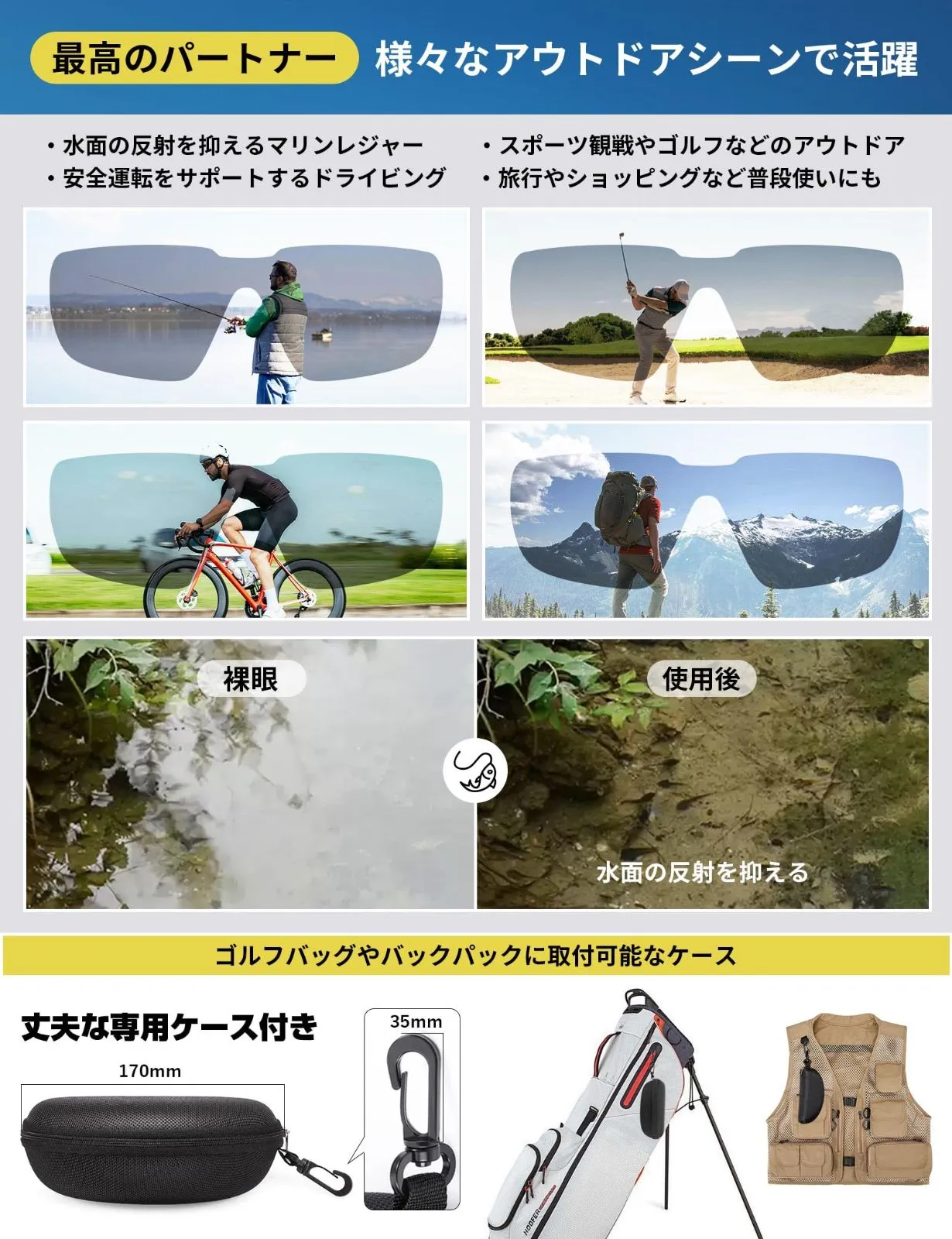 【偏光機能付き・クリアな視界を実現】 高性能偏光レンズが眩しさをカットし、水面の反射や路面のギラつきを効果的に抑制。釣りでは水中がクリアに見え、ゴルフでは芝目の判別が容易に。ドライビング時の安全運転もサポートし、旅行やショッピングなど普段使いにも最適です。