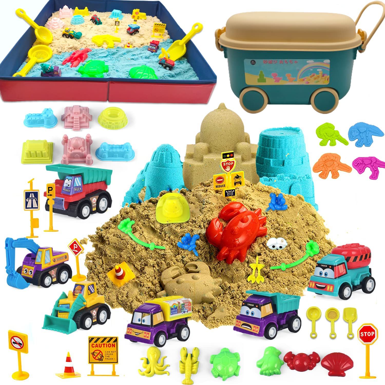 【砂遊び おもちゃセット】砂3.0kg(紫砂0.5kg、青砂1.5kg、原色砂1.0kg)、建設車両 おもちゃ6、道路標識10、折りたたみプール1、収納ボックス1、砂遊び スコップ3、面白パーツセットx7、16種類の金型(海洋動物、恐竜、城など)。総重量4 kg。
