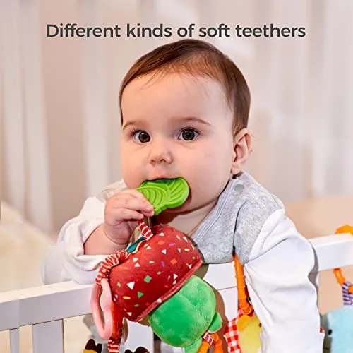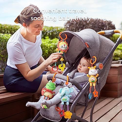 動物がぶら下がるデザイン:4つのユニークな動物 (鹿、ライオン、象、カエル) でデザインされた幼児のおもちゃセット。ベビーカーやベッドに簡単に掛けられる吊り下げリング付き。