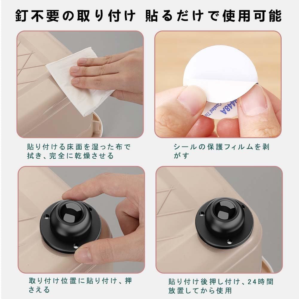 【使用方法】 このキャスターは、プラスチック、ステンレス、金属塗装面、木製品、プリント合板、ダンボールなどの表面に貼り付けて使用できます。ただし、使用前に両面テープを貼り付けた後は24時間放置する必要があります。また、滑らかな面に貼り付ける際は、凸凹のない表面に取り付けるか、ネジで固定してください。
