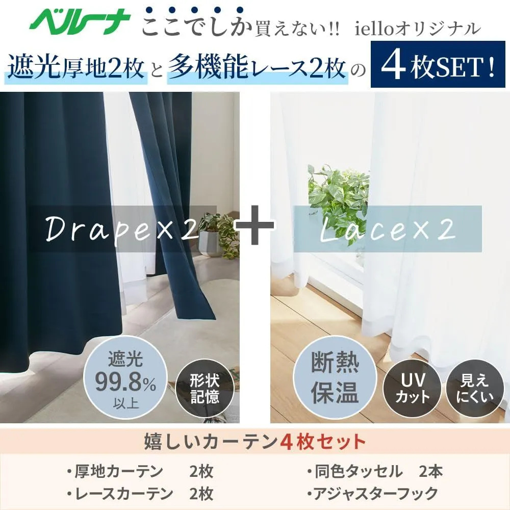 【新生活の準備に|これ1つで窓辺が完成する4枚セット】 厚地カーテン2枚とミラーレース2枚の計4枚をセットでお届け。別々に買い揃える手間がなく、届いたその日から新しいお部屋での生活をスタートできます。統一感のあるデザインで、急なお引越しや模様替えにも最適です。