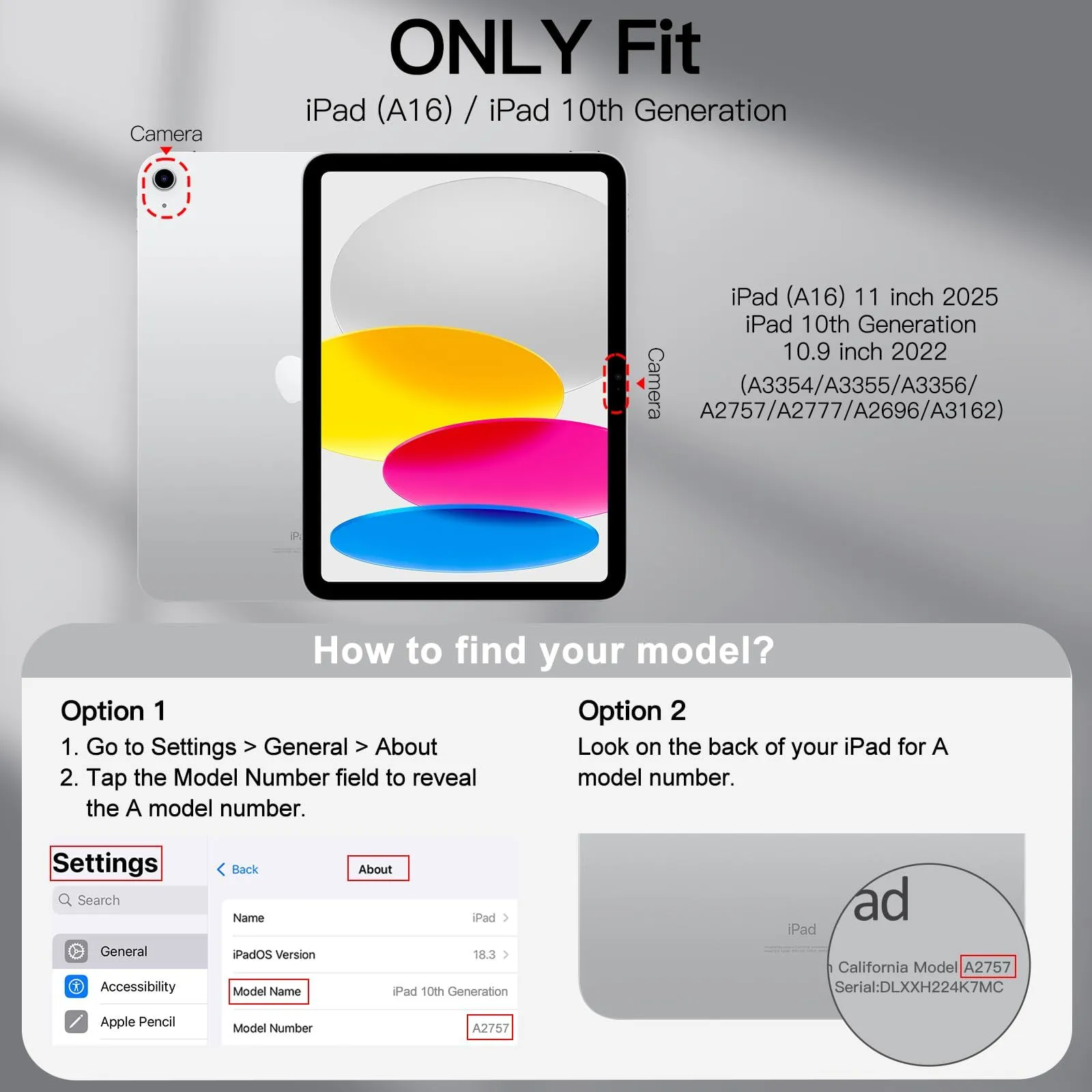[互換性] iPad(A16)第11/10世代(2025/2022モデル)用の特別デザインです。対応iPadモデル:A3354 / A3355 / A3356 / A2696 / A2757 / A2777 / A3162。「設定」>「一般」>「情報」の順に選択します、「モデル番号」フィールドをタップしてAモデル番号を表示します