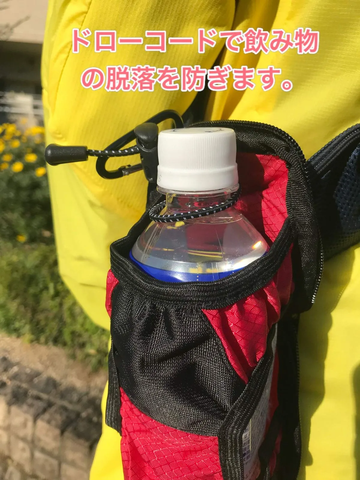 【落下防止】ホルダーがしっかりボトルにフィットしますし、付属のドローコードやベルクロでボトルを固定すれば更に安心。落下の心配なく飲み物を携帯できます。