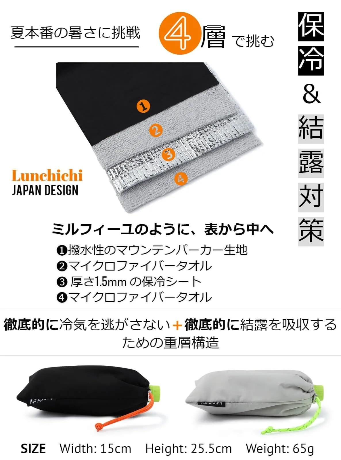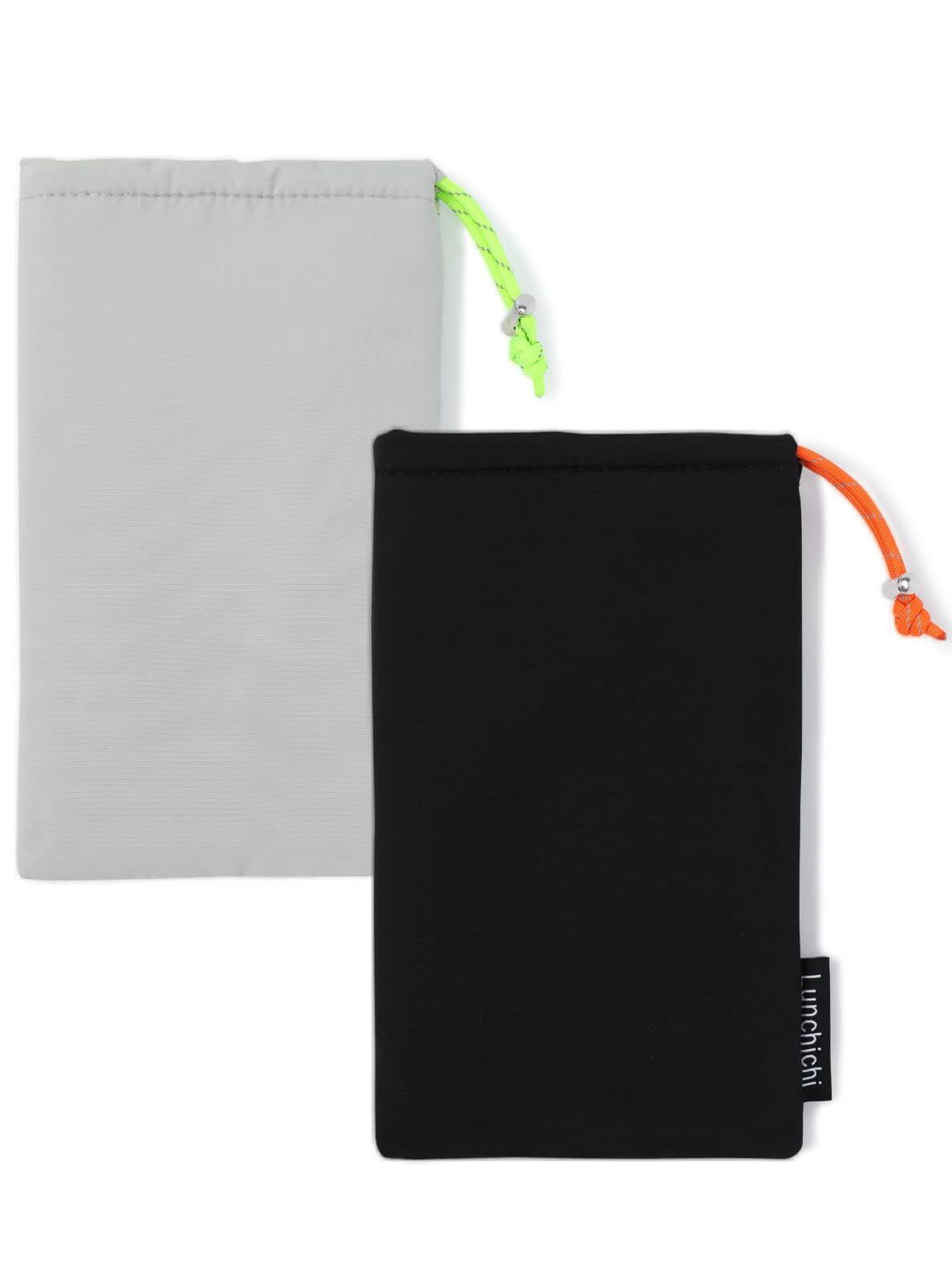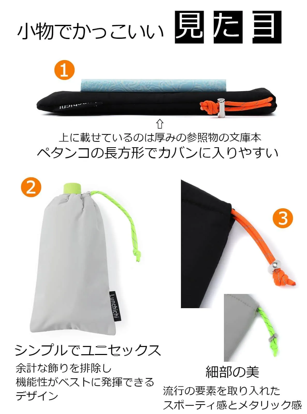 【小物でかっこいい見た目】黒とライトグレーの2色のバリエーションにオレンジと蛍光グリーンがそれぞれ配色された洗練したデザインです。伝統的な巾着袋の作りをベースに、ペットボトルのサイズに合わせた長方形の形でかさばらないためカバンやリュックに収納しやすいです。そして、4層ではありますが機能性を発揮できる軽量生地を厳選したため、厚さ1.5cm/重さ65gとスマートで軽いです。
