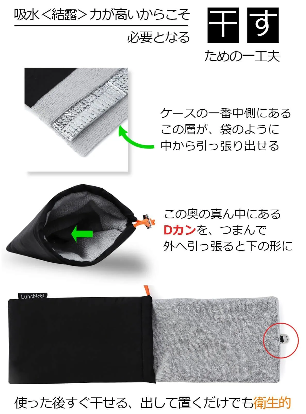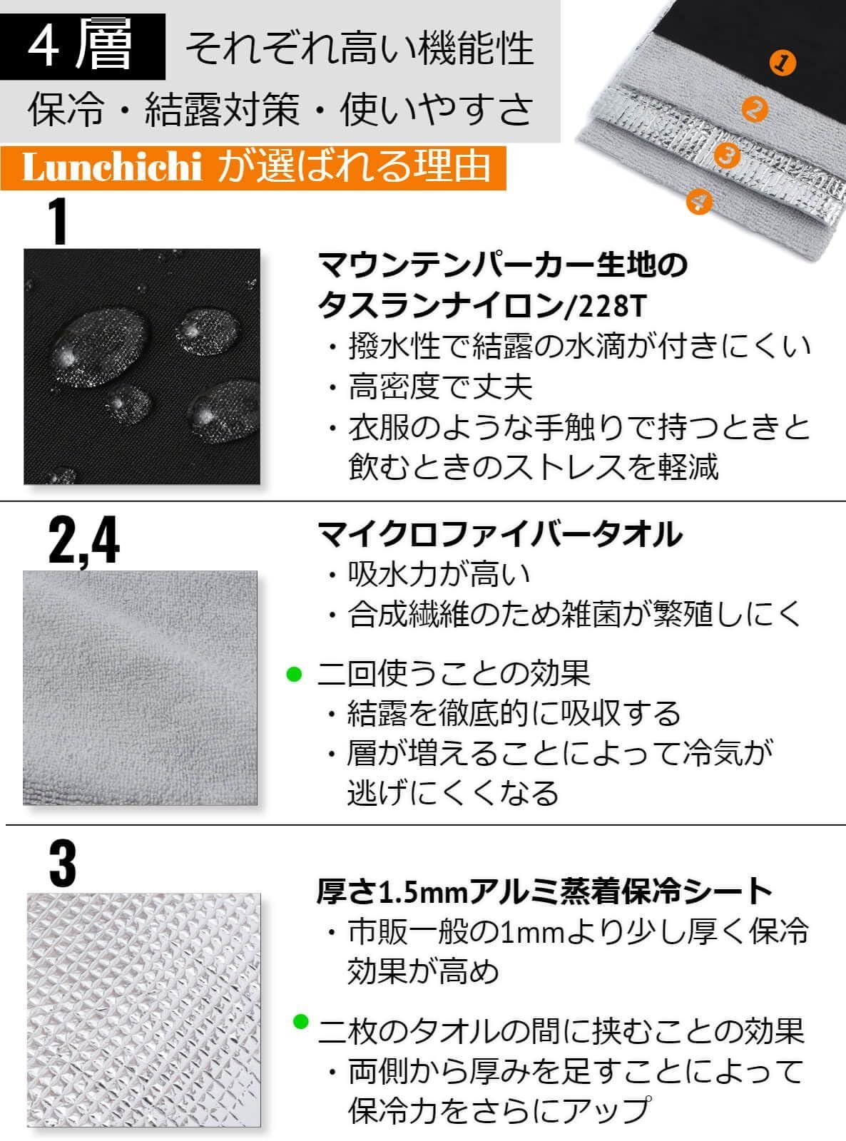 【4層で結露対策】4層中2層がマイクロファイバータオルであるため、結露に対する吸収力が高いです。そして、表生地は撥水性の素材を使用しているため結露の水滴が付きにくい、というように外側からの対策も施されています。さらに結露対策の一環として使用後の干すことにも施策を講じて、一番中側にあるマイクロファイバータオルは、本体から引っ張り出せる作りになっています。使用後引っ張り出せば簡単に干すことができます。清潔の面においても本商品はとても使いやすいです。