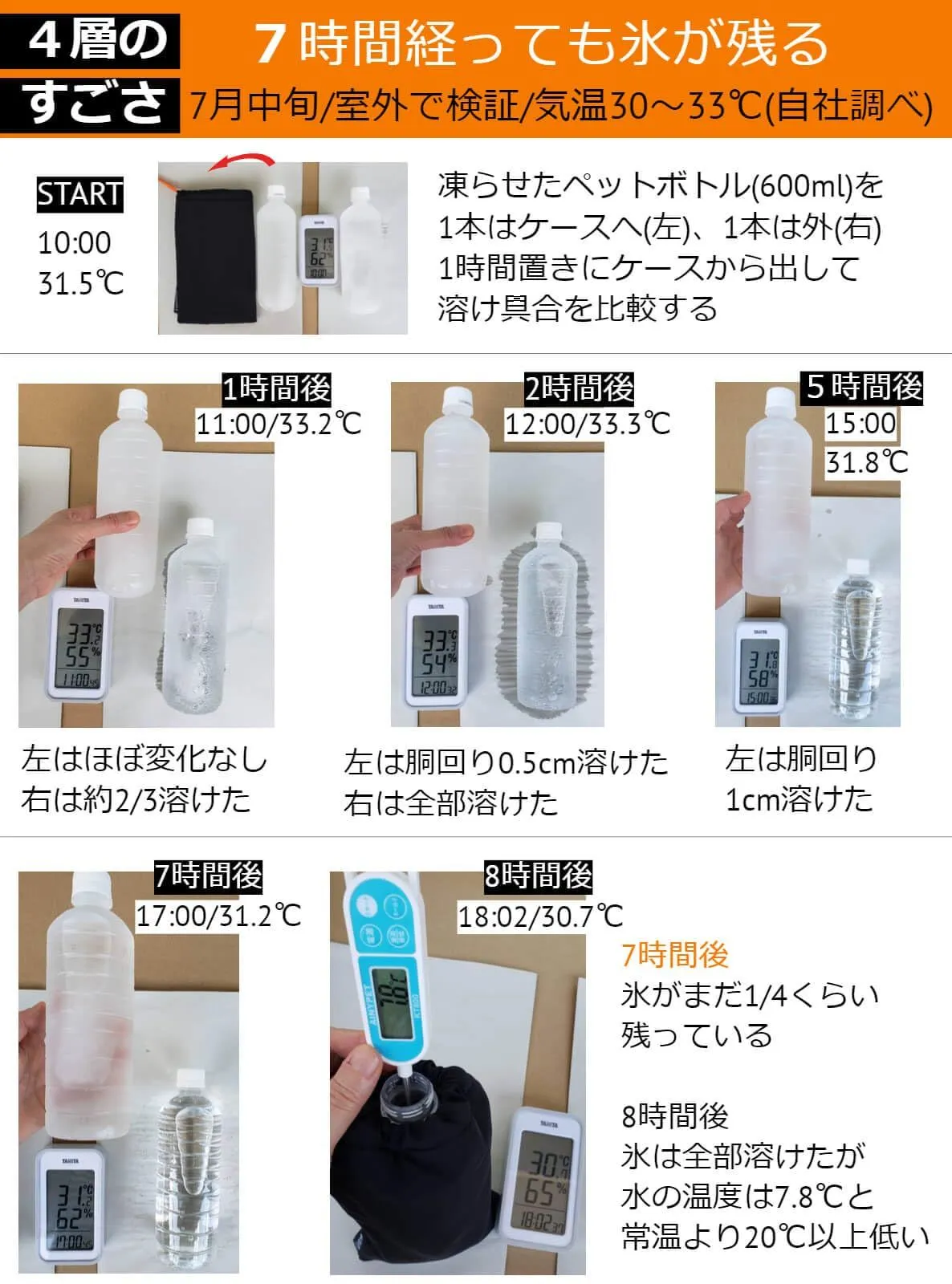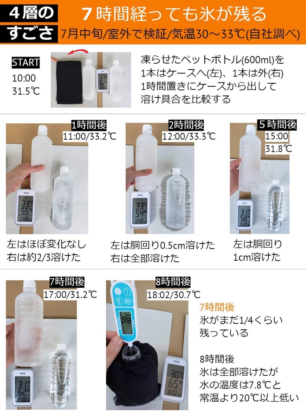 【4層で熱中症対策】ミルフィーユのように生地が4層にも重なっている、他にないペットボトル用保冷ケースです。30~33℃の室外で「7時間経っても氷が残る」という抜群な保冷力を持ち、冷たい水を長時間にわたって飲み続けることができます。そして本商品の氷が溶けにくい機能性を生かし、室外での冷却源として凍ったペットボトルを入れ時々出して手で握ったり首に当てたりするなど、体を冷却するためにも使えます。夏の熱中症予防に大きく役立ちます。