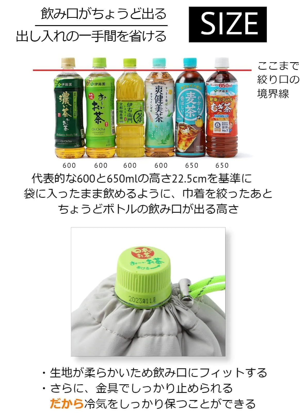 【ペットボトルを出さずに飲める】600~650mlのペットボトルの高さを基準に、ペットボトルが袋に入ったまま飲めるようなサイズとなっています。巾着の絞り口がちょうど蓋の下まで来ているので飲むたびにペットボトルをケースから出す必要はありません。飲むまでの動作がスムーズで、出し入れの一手間が省けます。