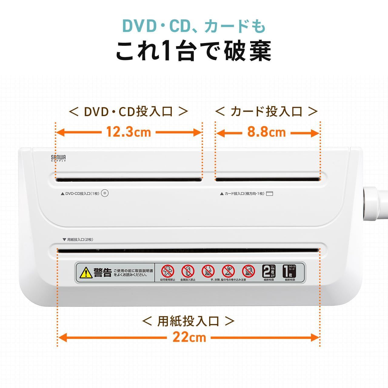 【紙もメディアもこれ1台】 A4用紙 (最大2枚)に加え、 CD ・ DVD ・ カード もそのまま 細断 可能。1台でまとめて処理できます。
