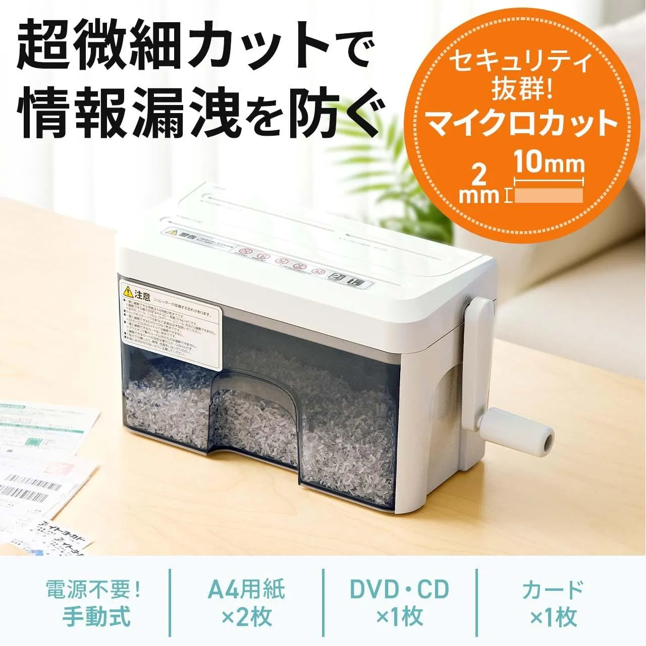 【個人情報をしっかり守る】2×10mmの マイクロカット で 細かく 細断。 住所 や 明細書 などの 情報漏えい 対策に 最適 です。