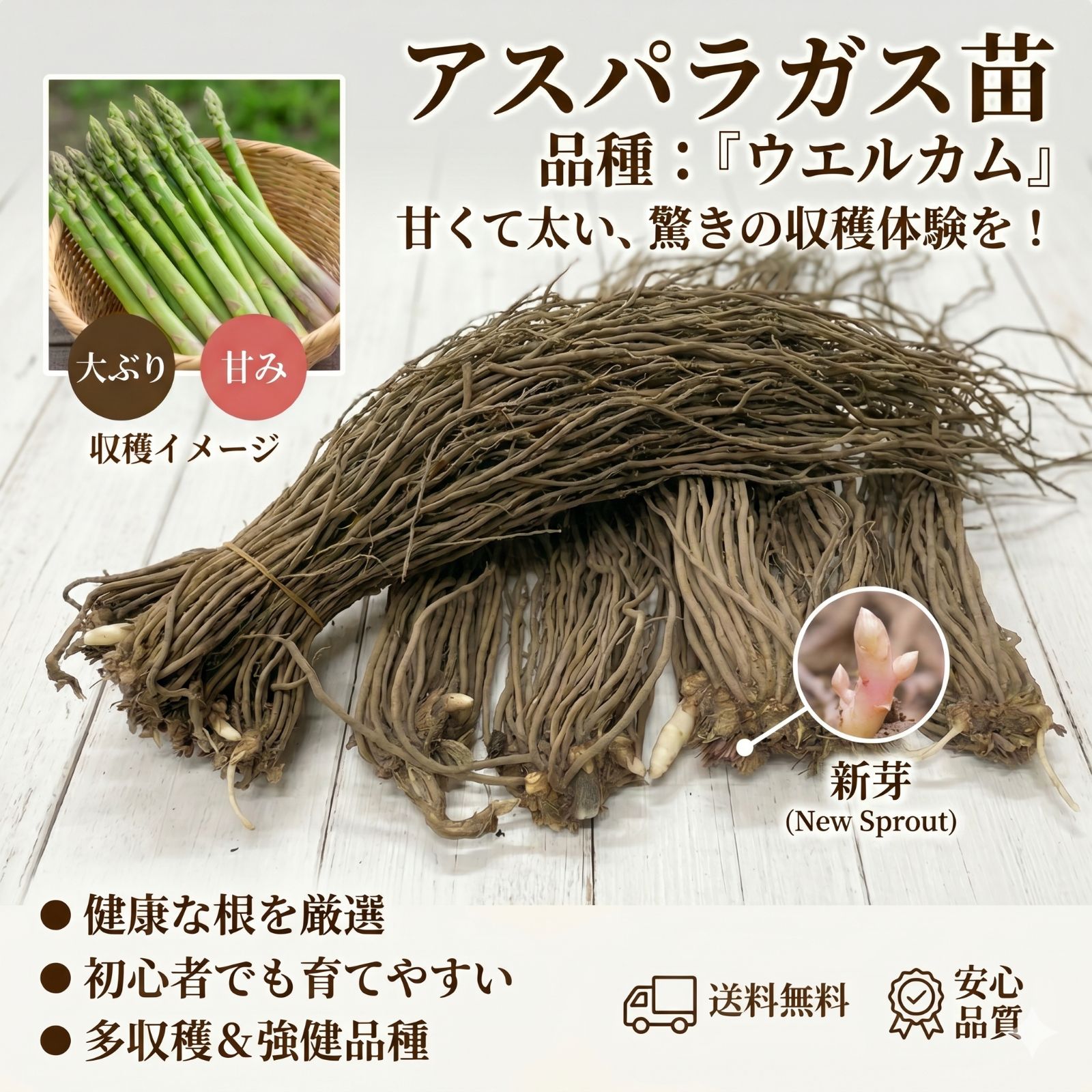 早生品種で春のシーズン初期から勢いよく芽吹き、L〜2Lサイズの太くて立派なアスパラガスを多収穫できます。穂先の締まりと鮮やかな緑色も抜群です。草勢が非常に強く生育が揃いやすいため、初めての方でも失敗が少なく、斑点病・立枯病・連作障害にも比較的強い丈夫な品種です。耐寒性が強く、寒冷地から暖地まで全国で栽培いただけます。