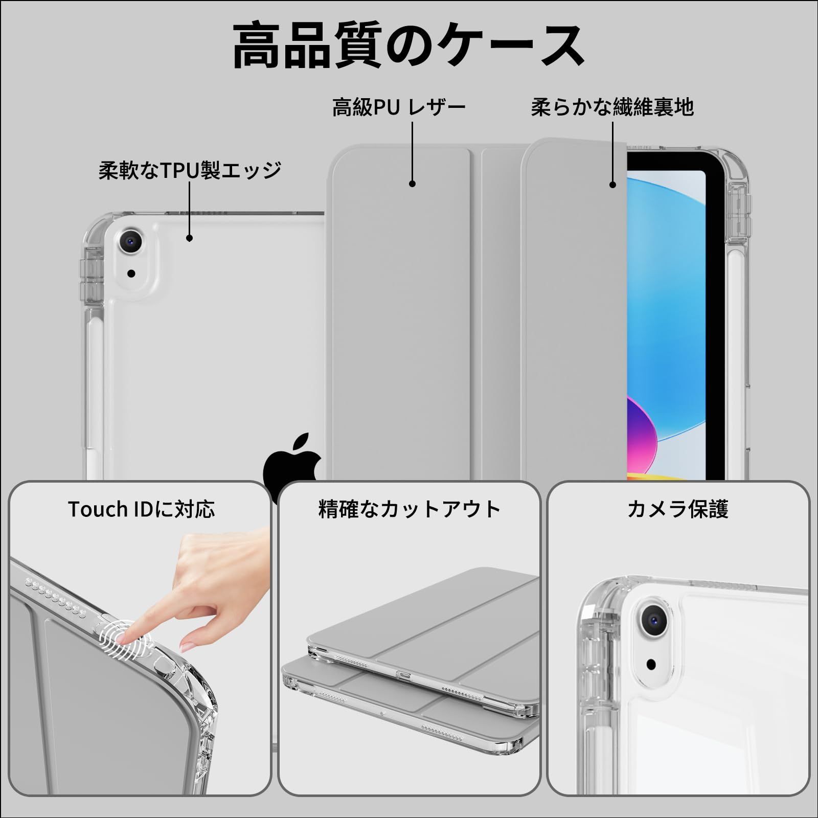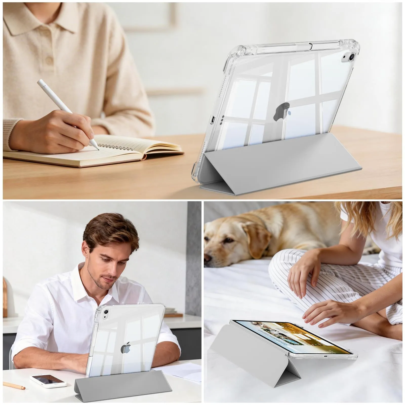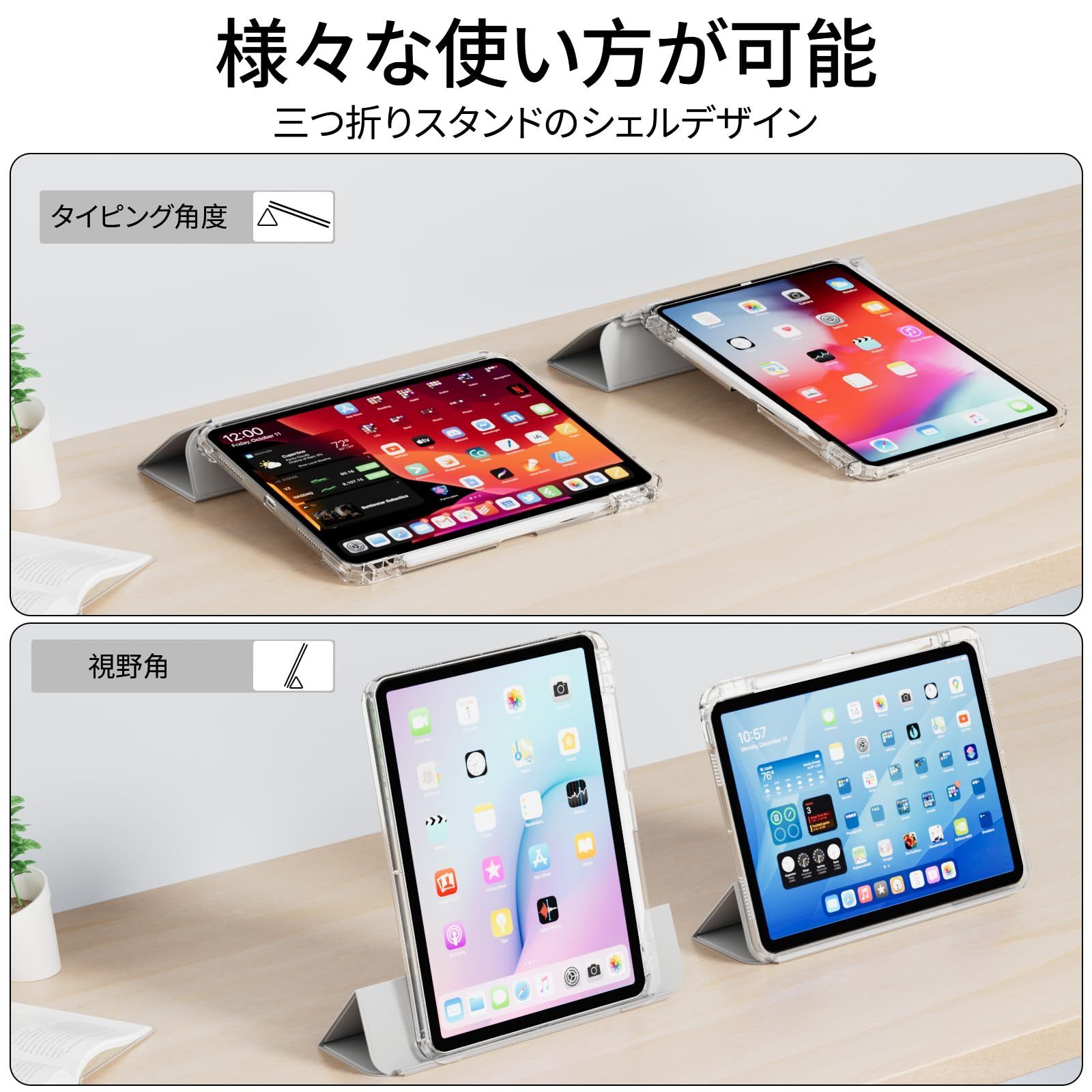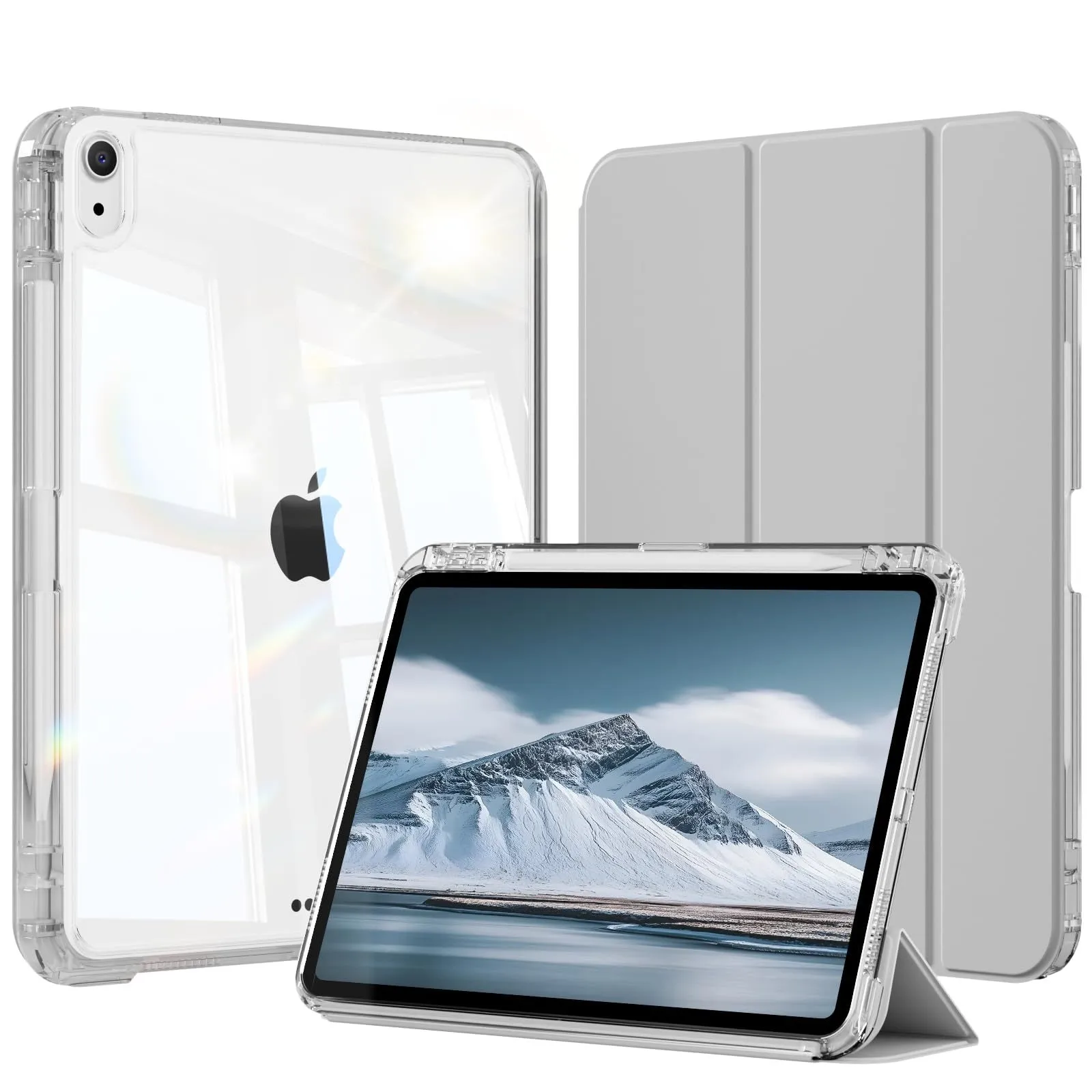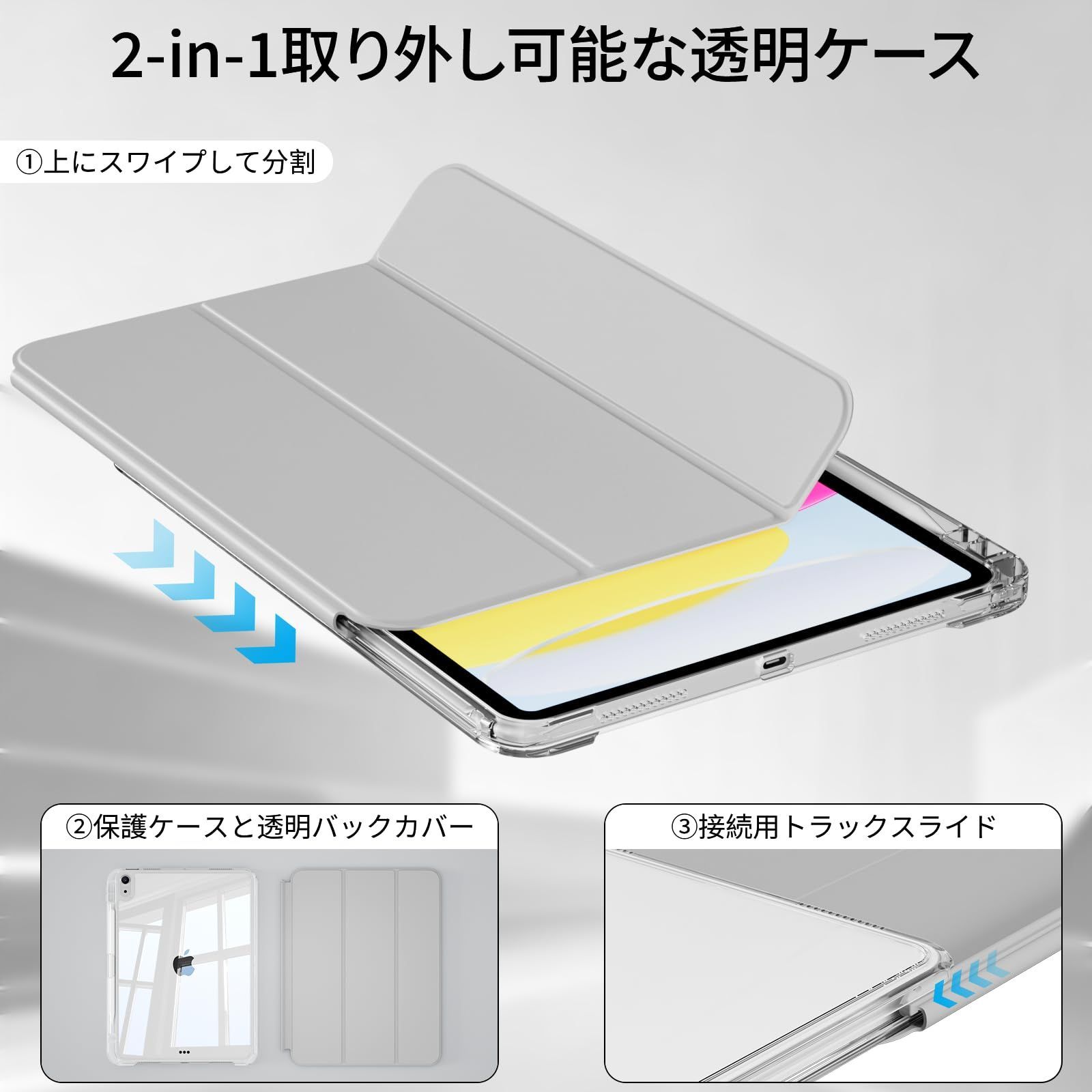 対応iPad Air 11インチケース M4/M3/M2 (2026/2025/2024) 第8/7/6世代 iPad Air 第5/4世代 10.9 インチケース(2022/2020) 透明バックカバー 取り外し可能 縦置 横置 三つ折スタンド Pencil 収納可能 ワイヤレス充電対応 傷つけ防止 軽量 薄型 (グレー)