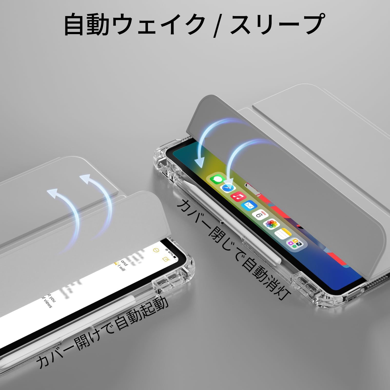 【オートスリープ機能】iPad air 11インチ ケース 透明 は、フタを閉じると画面が自動的に消え、フタを開くと画面が自動的に点灯します。この機能により、タブレットを使用していない時に画面が点灯し続けることを防ぎ、スクリーン使用時間とバッテリーの寿命を延ばすことができるため、非常に使い勝手が良いです。