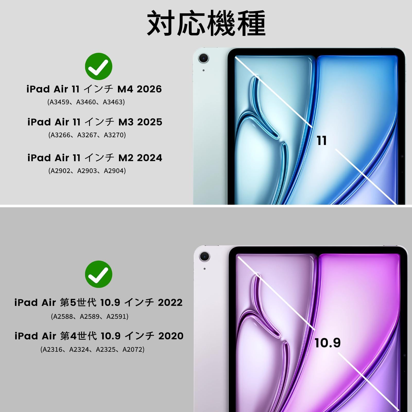 【対応機種】2026年発売の iPad Air 11インチ M4 第8世代 (モデル番号: A3461/A3462/A3463/A3464); 2025年発売の iPad Air 11インチ M3 第7世代 (モデル番号: A3266/A3267/A3270); 2024年発売の iPad Air 11インチ M2 第6世代 (モデル番号: A2902/A2903/A2904); 2022年発売の iPad Air 第5世代 10.9インチ (モデル番号: A2591/A2589/A2588); と2020年発売の iPad Air 第4世代 10.9インチ (モデル番号: A2316/A2324/A2325/A2072)。ご購入前にお手元のデバイスのモデル番号をご確認ください。