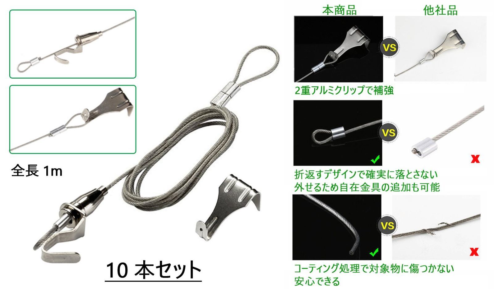 INIBUD ピクチャーレール ワイヤー フック 10本セット ステンレス コーティング 展示用 調節自在 額受 金具 (1m)