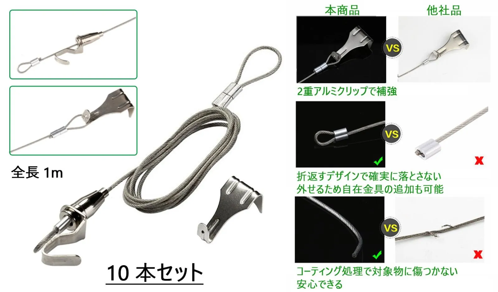 ワイヤー表面を樹脂でコーティング、留め具部品は二重アルミクリップで補強、落下防止クリップが外せ自在金具の増減が可能。