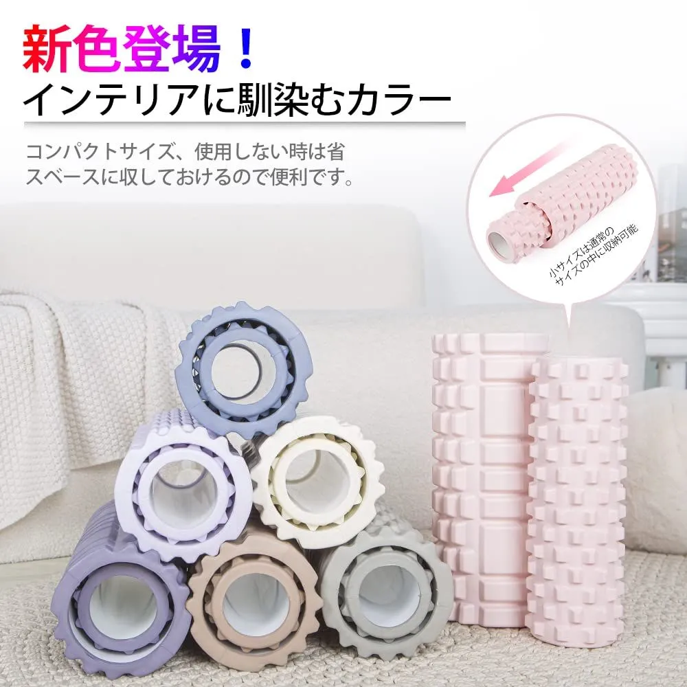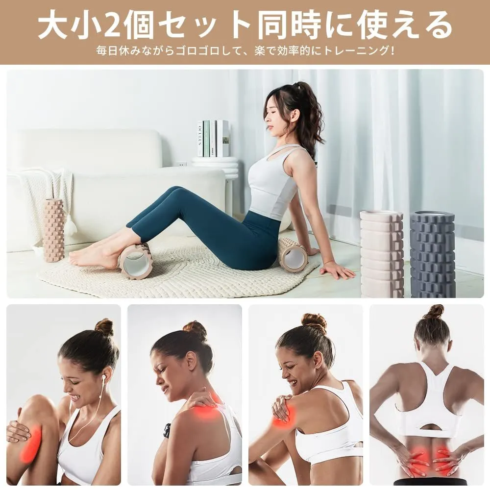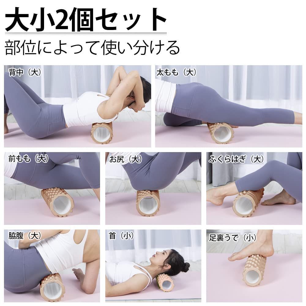 【全身に対応:お得な大・小2個セット】大きいフォームローラー:長さ33cm×直径14cm 小さいフォームローラー:長さ30.7cm×直径9.7cm フォームローラーは2個セット、サイズが違うので、身体の部位によって使い分けができます。直径が大きいため、全身をリラックスして、痛気持ちいい感じがあります。直径が小さいと仰向けで背中や腰をコロコロしやすく、とても楽になります。大きいフォームローラーは自宅でのご使用、小さいフォームローラーは持ち歩きに便利です。