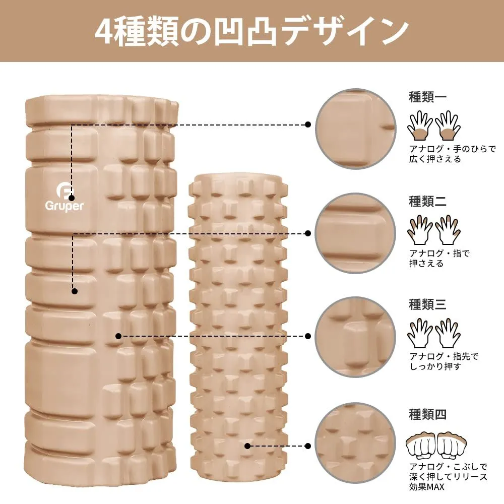 【筋膜リリース】表面には4種類の凹凸があり、手のひらのような平らな形状、指のようなチューブ形状、指先のような突起した形状、こぶしのような突起が筋膜の奥に入り込み、体を揉みほぐします。種類四が足裏をローリングするのは最適です。筋膜ローラーは筋膜リリースを目的として、毎日5~10分だけ、全身を使用して、運動不足を解消して、ジムに行く時間がない方に適します。家で筋膜ローラーを使用しながら手軽なトレーニングにも適します。