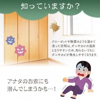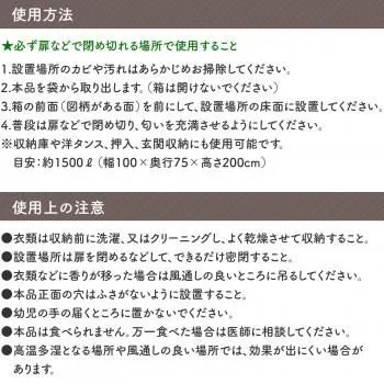 クローゼットや物置、納戸などのダニやカビが発生しやすい場所に置くだけ!天然ハーブの香りがダニよけやカビよけ効果を約半年間発揮します。化学防虫剤不使用で、他の防虫剤とも併用可能です。