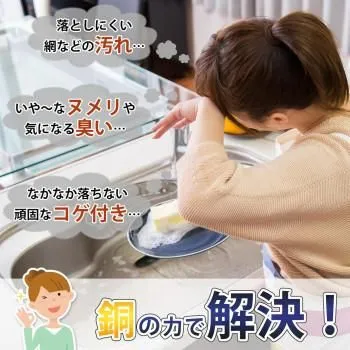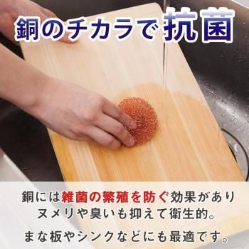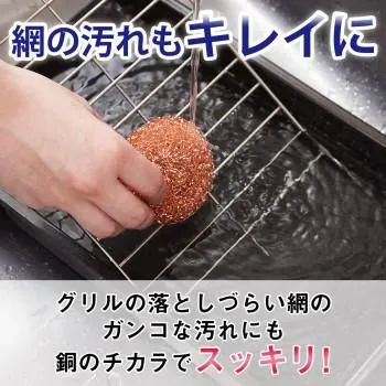 銅の力で汚れをすっきり!銅製タワシ5個組。純銅には雑菌の繁殖を防ぎ、ヌメリや臭いを抑える効果があります。そのため、まな板やシンクのお手入れ、また、お鍋やコンロ、グリルなどのしつこい汚れや焦付きもすっきり落とせます!そして使用後は、銅製タワシ自体も水洗いすれば、いやな臭いやヌメリを防ぐことができます。