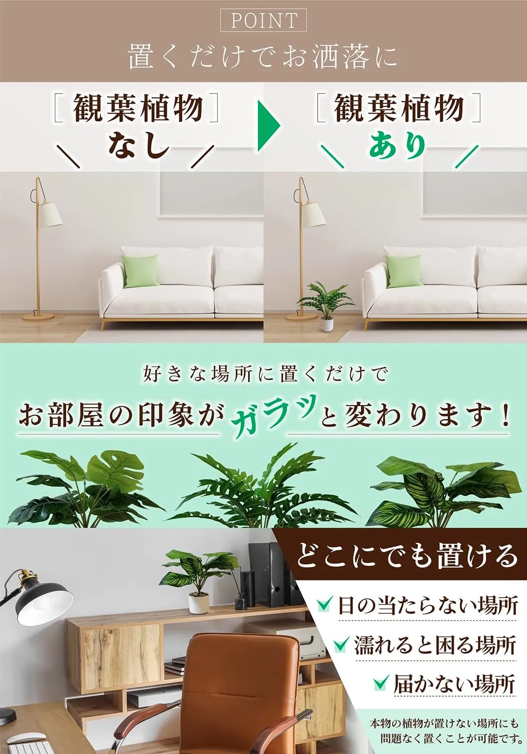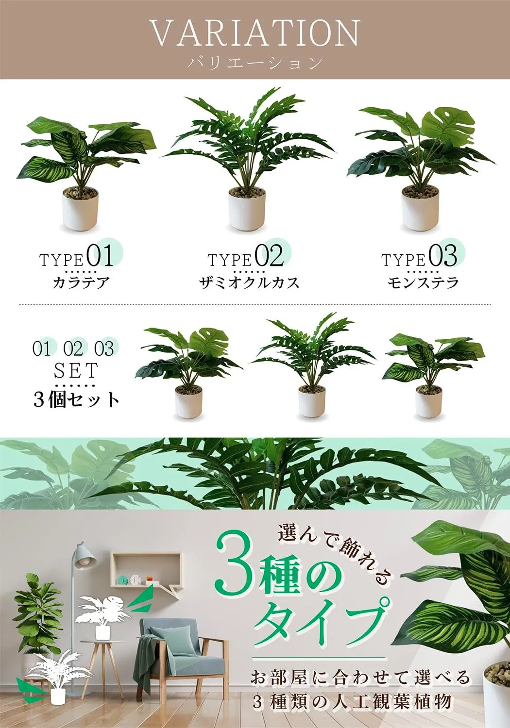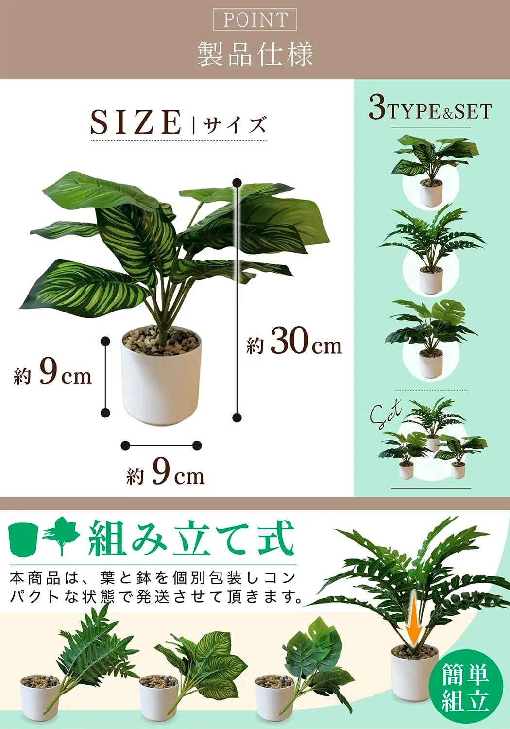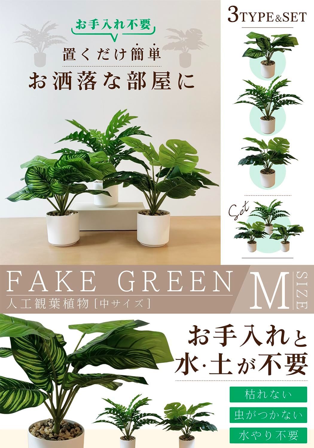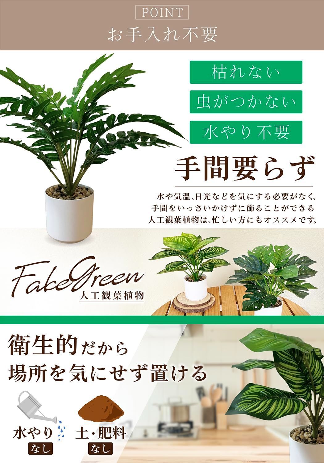 植物初心者にもおすすめ。手軽にグリーンを楽しめるセットです。 ホコリが気になったらサッと拭くだけ。お手入れ簡単フェイクグリーン。