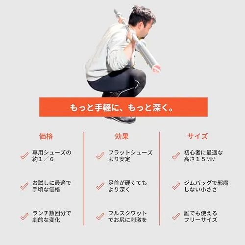 【圧倒的コスパ:3万円の専用シューズはもう不要】 数万円するウェイトリフティングシューズ(スクワットシューズ)と同等の機能をこの価格で手に入れることができます。高価な靴を買い足す必要はなく、今履いているお気に入りのトレーニングシューズやフラットシューズを「スクワット仕様」に即座にアップデート。