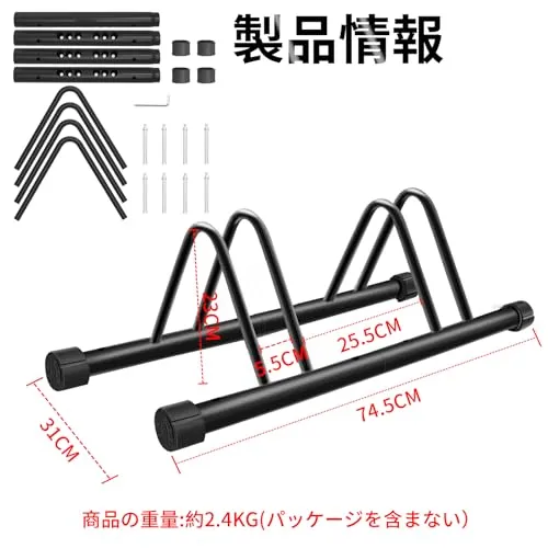 【サイズ】幅74.5cm 奥行31cm 高さ23cm 車輪幅5.5cm( こども 幼児車や原付/その他一部のタイヤに合わない場合がありますのでご了承ください。)従来の一段式サイクルラックとは異なり、2台の自転車を同時に収納できる。、便利性が一気にアップします。