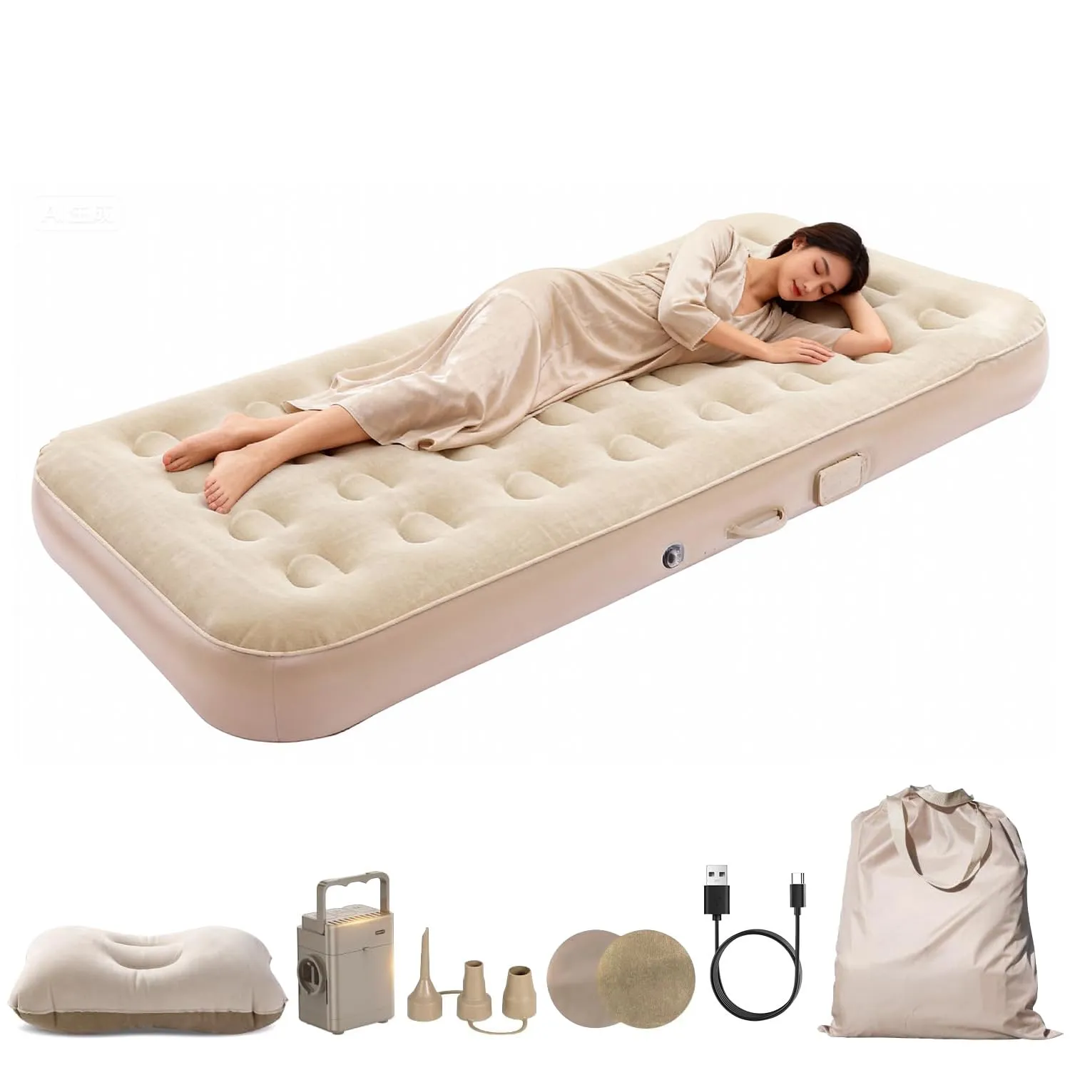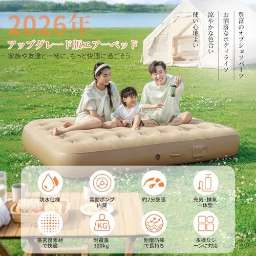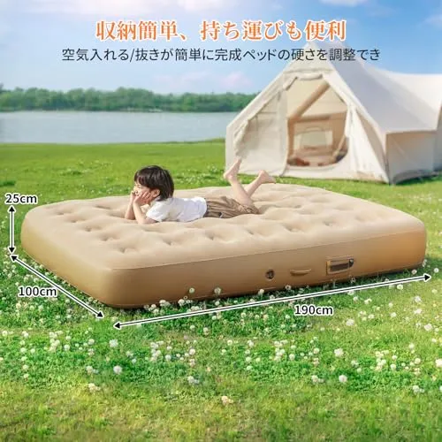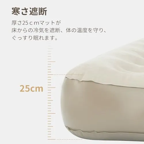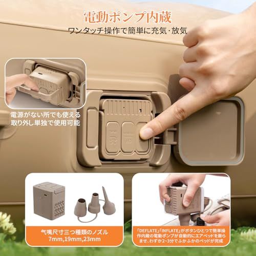 【電動ポンプ内蔵・自動膨張】最新設計の電動ポンプをベッド本体に内蔵しており、ボタンを押すだけで自動的に膨張・収縮が可能。わずか約2分でしっかりとしたベッドが完成します。外部電源は不要で、Type-C充電式を採用。1回の充電で約4~6回使用できるため、キャンプ・車中泊・防災時など、あらゆるシーンで活躍します。さらに、ポンプは取り外し可能で、付属の3種類のノズルを使えば浮き輪やボールなど他のエアー製品にも対応。コンパクトながらも高出力のモーターを搭載し、スムーズかつ静音性の高い動作を実現しています。