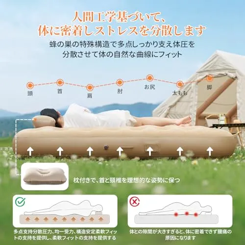 【極上の安定感と快適性 - 32孔ハニカムサポート構造】新開発の32孔ハニカム構造を採用し、体全体を複数のポイントでしっかり支えます。寝返りをうっても揺れが伝わりにくく、どんな体勢でも自然な姿勢をキープ。人間工学に基づいた立体構造が、腰や背中への負担を軽減し、長時間横になっても疲れにくい設計です。また、内部の空気層が体圧を均等に分散することで、沈み込みを防ぎ、まるで高級マットレスのような寝心地を実現しました。底面には高強度PVC素材を使用し、耐摩耗性・耐穿孔性に優れ、長くお使いい