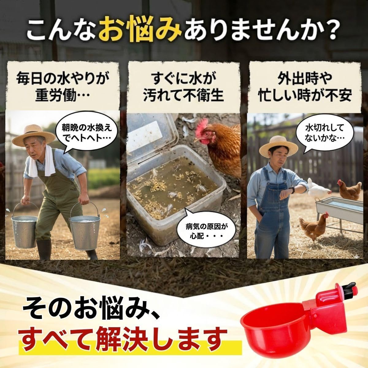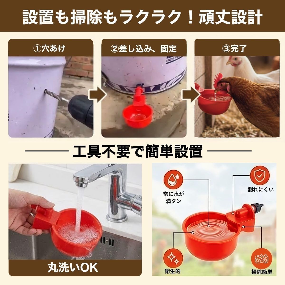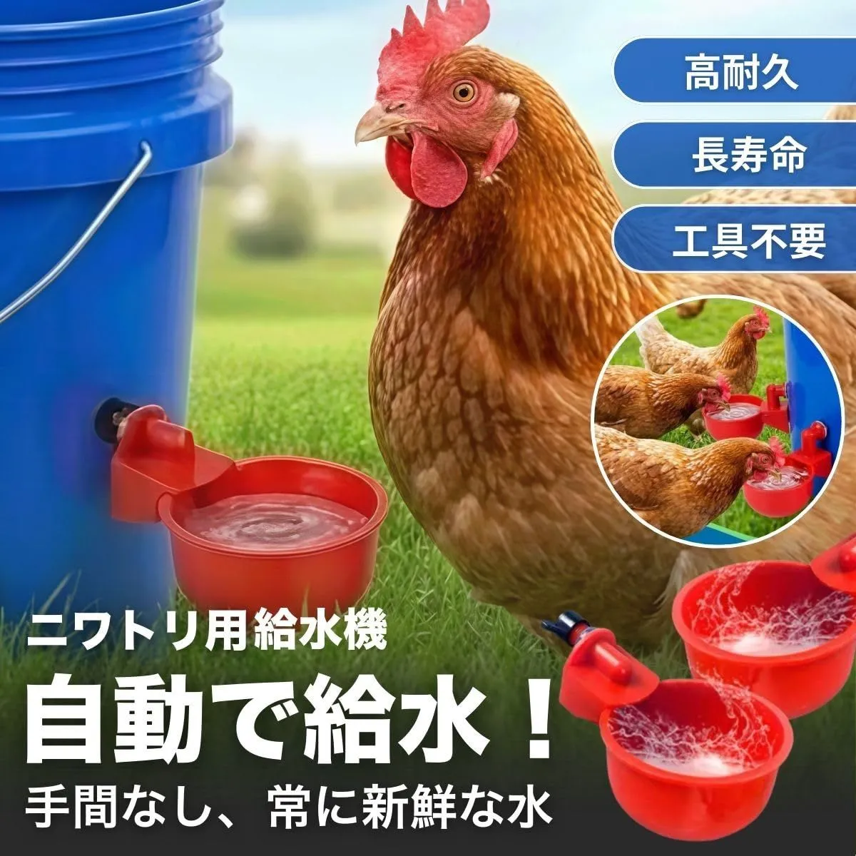 【水やりの手間から解放!常に新鮮な水を自動供給】 ニワトリやウズラが飲み口をつつくことで、減った分だけ自動的に水が補充される画期的な給水カップです。「朝晩の水換えが重労働」「外出時に水切れしないか心配」といった飼い主様のお悩みを一気に解決します。常に新鮮な水が供給されるため夏場の水温上昇や汚れによる劣化も防止。愛鳥には快適な飼育環境を、飼い主様にはゆとりある時間を提供する飼育の必須アイテムです。