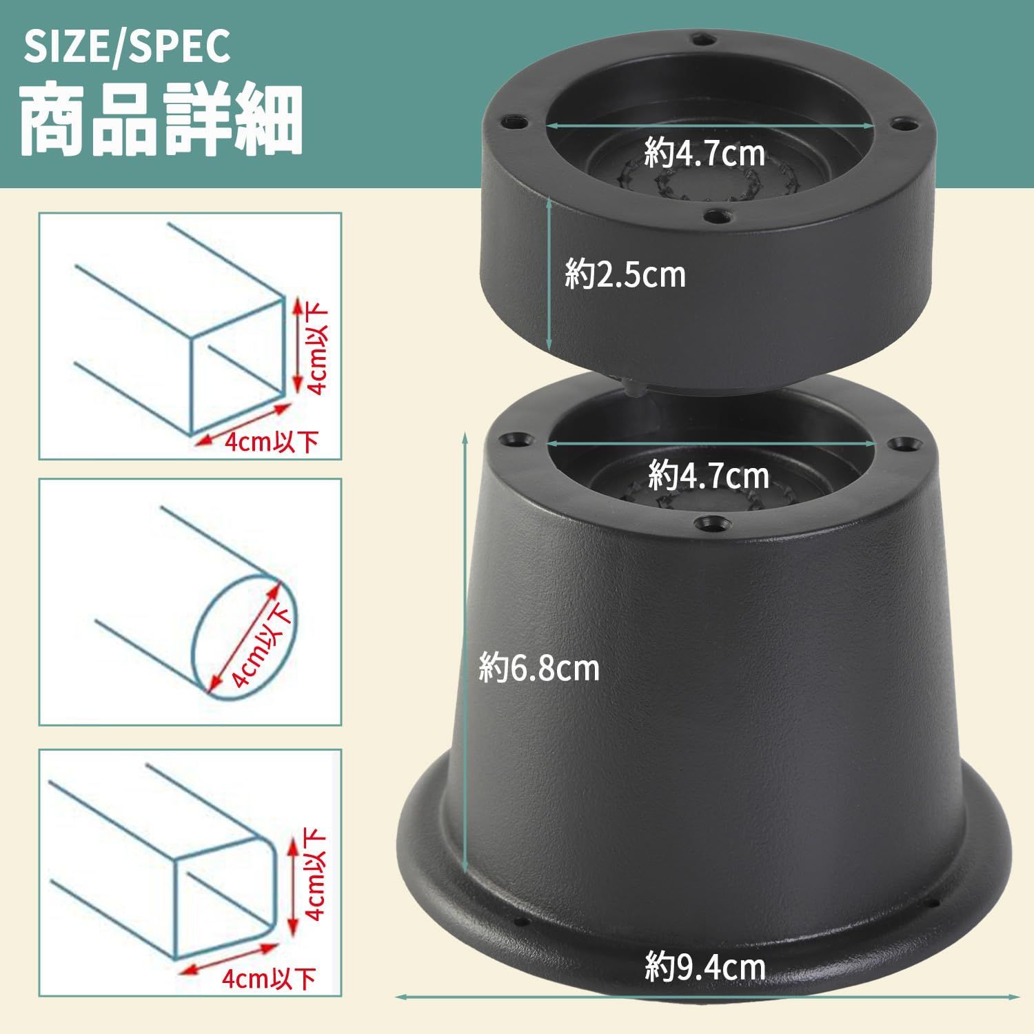 【幅広い用途】 ベッド、こたつ、テーブル、ソファーはもちろん、洗濯機や冷蔵庫など大型家電まで幅広い脚付き家具に対応します(耐荷重1200kg)。1セット4個入りで4本脚の家具にぴったり。6本脚以上の家具でも複数セット併用でご使用可能です。