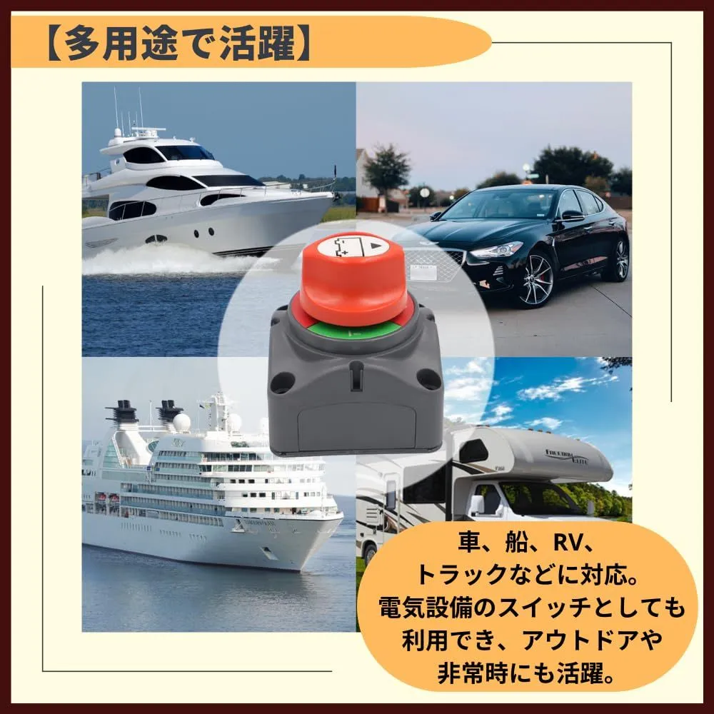 【多用途で活躍】車、船、RV、トラックなどに対応。電気設備のスイッチとしても利用でき、アウトドアや非常時にも活躍。