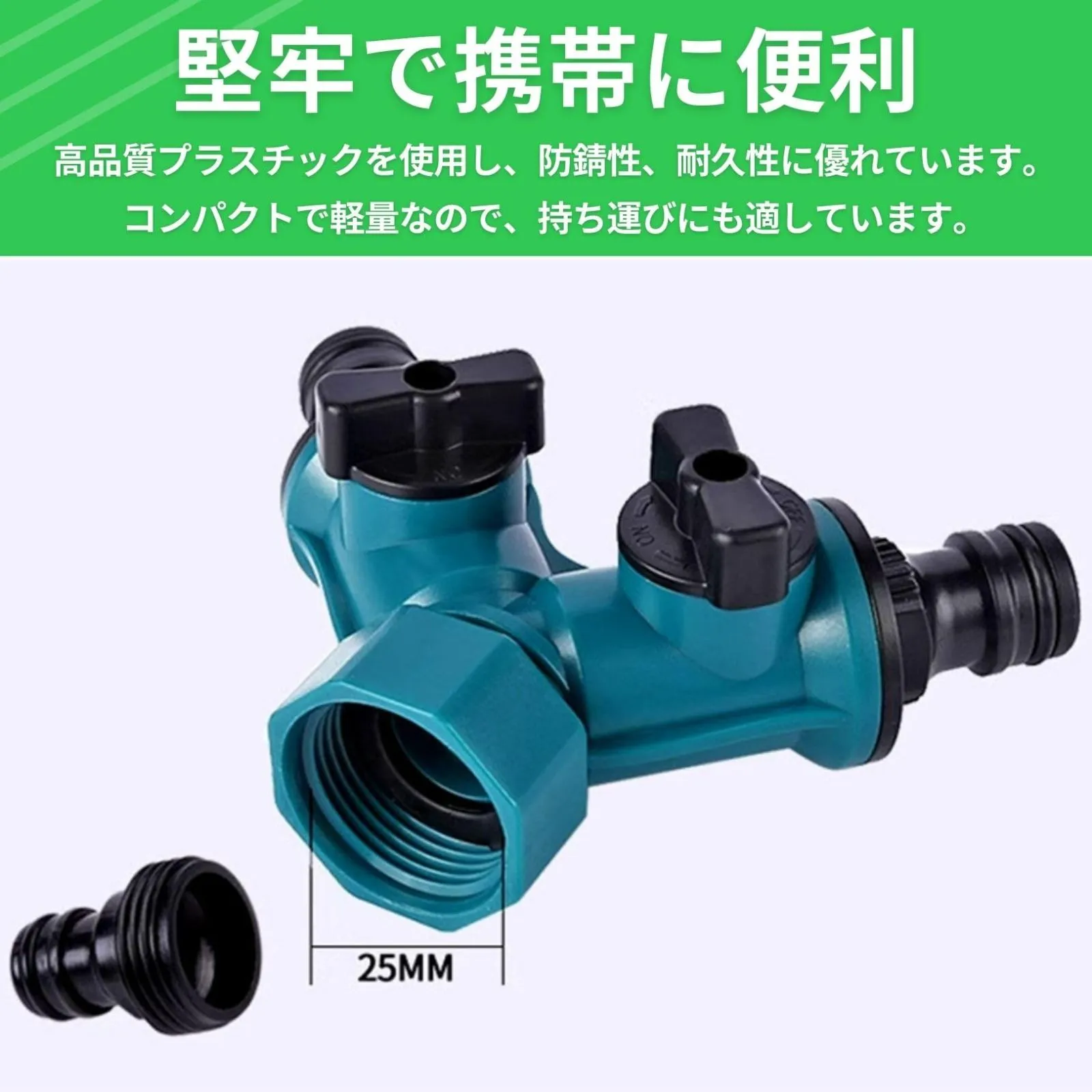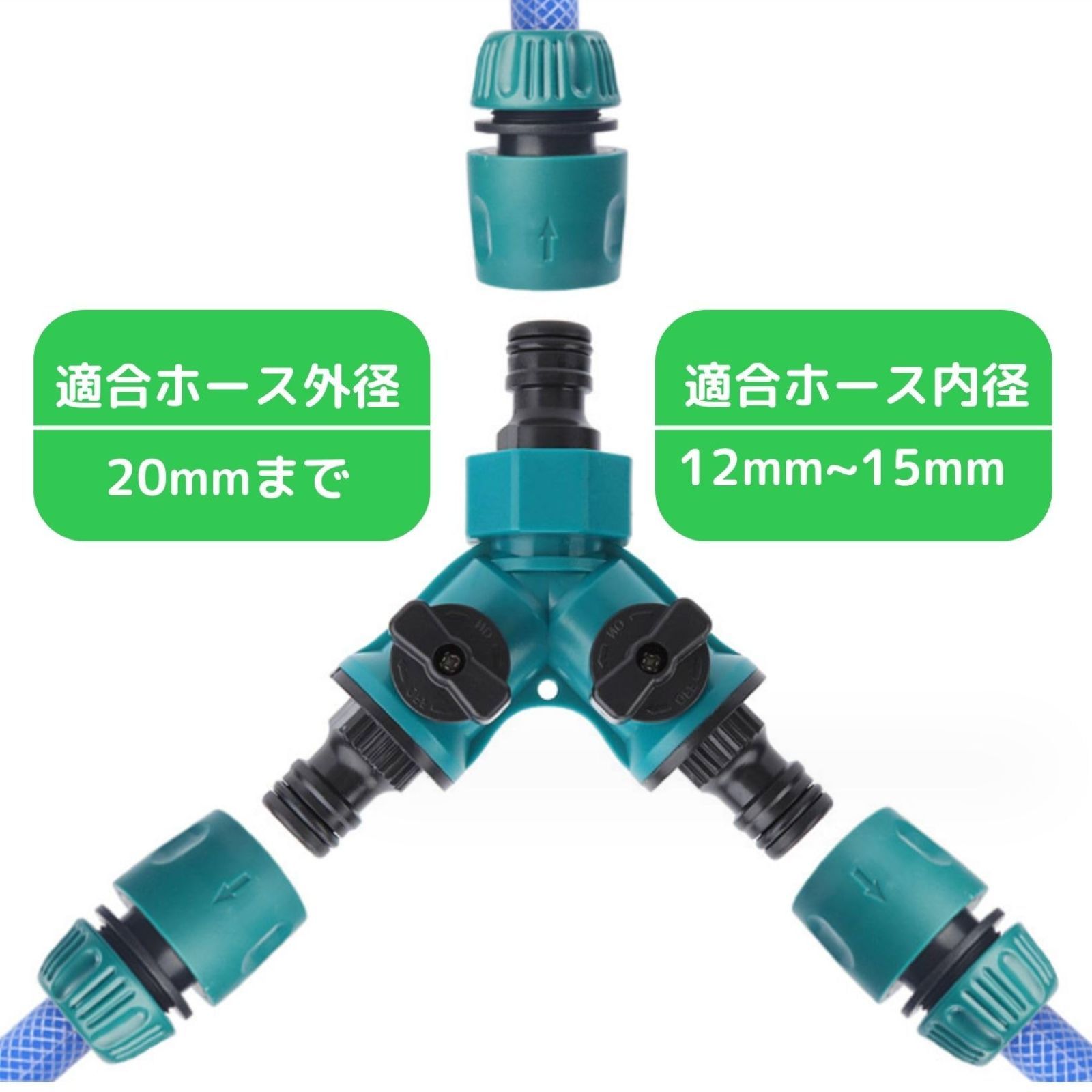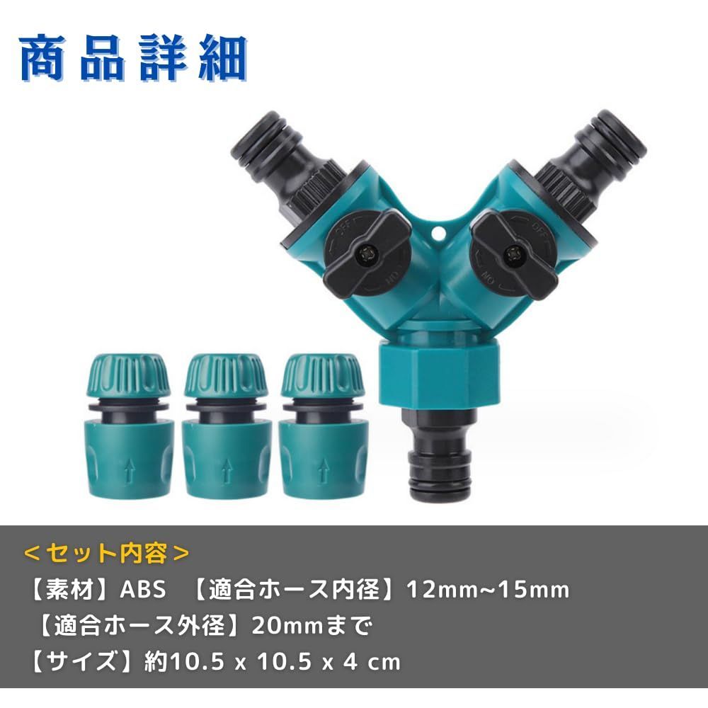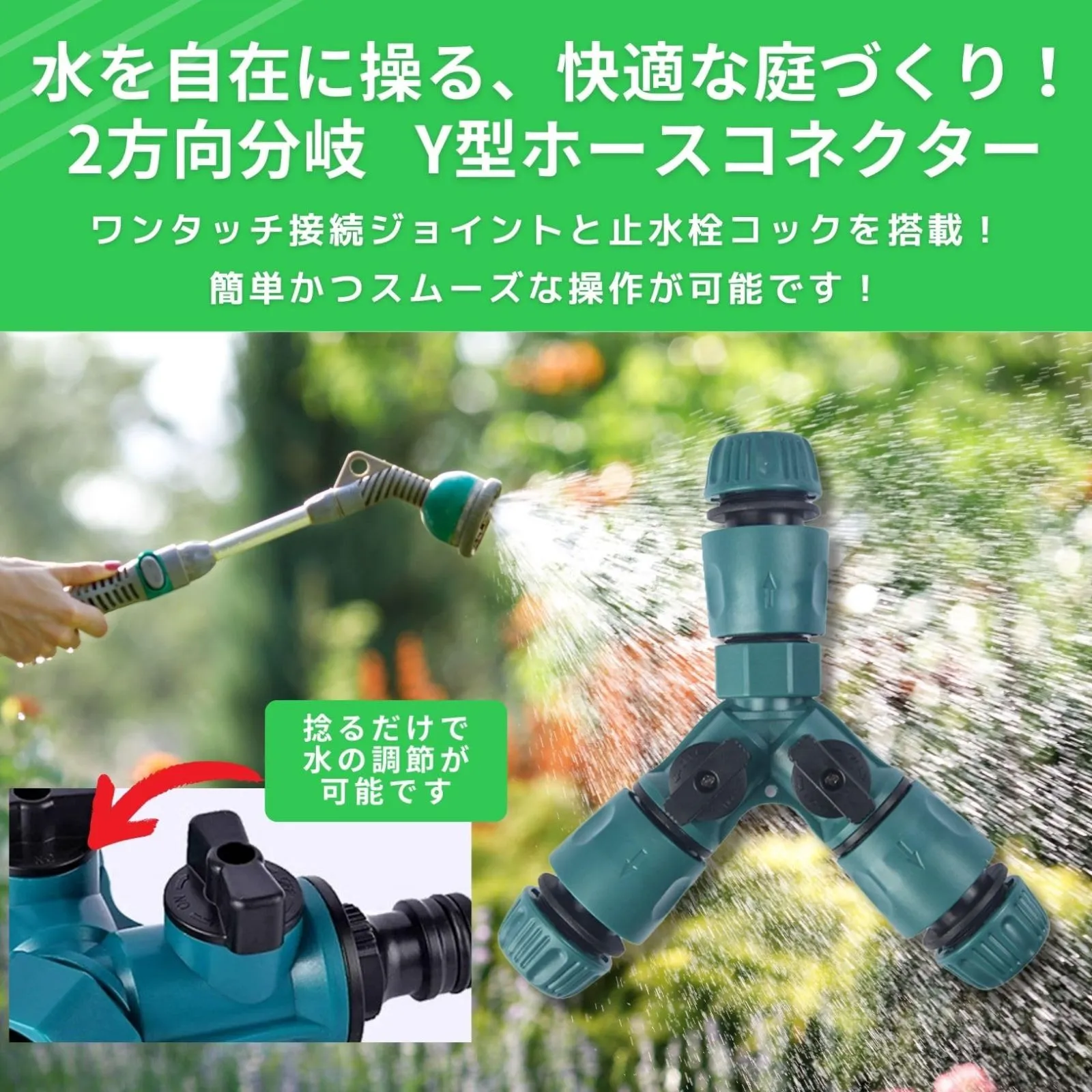 【水を自在に操る、快適な庭づくり!2方向分岐Y型ホースコネクター】この2方向分岐ホースコネクターは、ワンタッチの接続ジョイントおよび左右90度回転の止水栓コックを搭載し、簡単かつスムーズな操作が可能です。